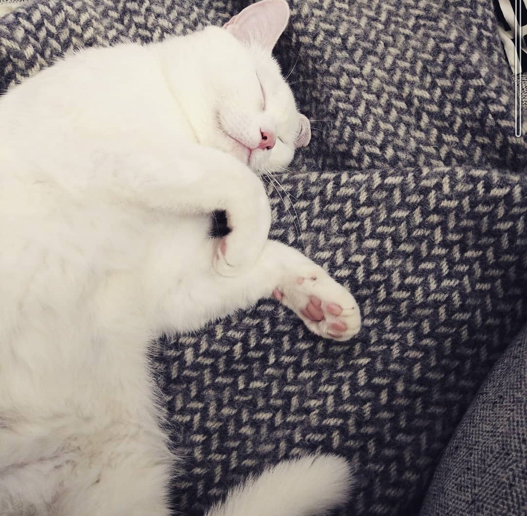 保護された当時はガリガリで、酷い風邪と真菌により衰弱していたため、はんぺんのようにふっくらと育つように!と願いを込めてボランティアさんが名付けてくださっていました。私たちもその名前がとても気に入り、こうしてはんぺん太は我が家の家族になりました (現在、推定一歳半です)。