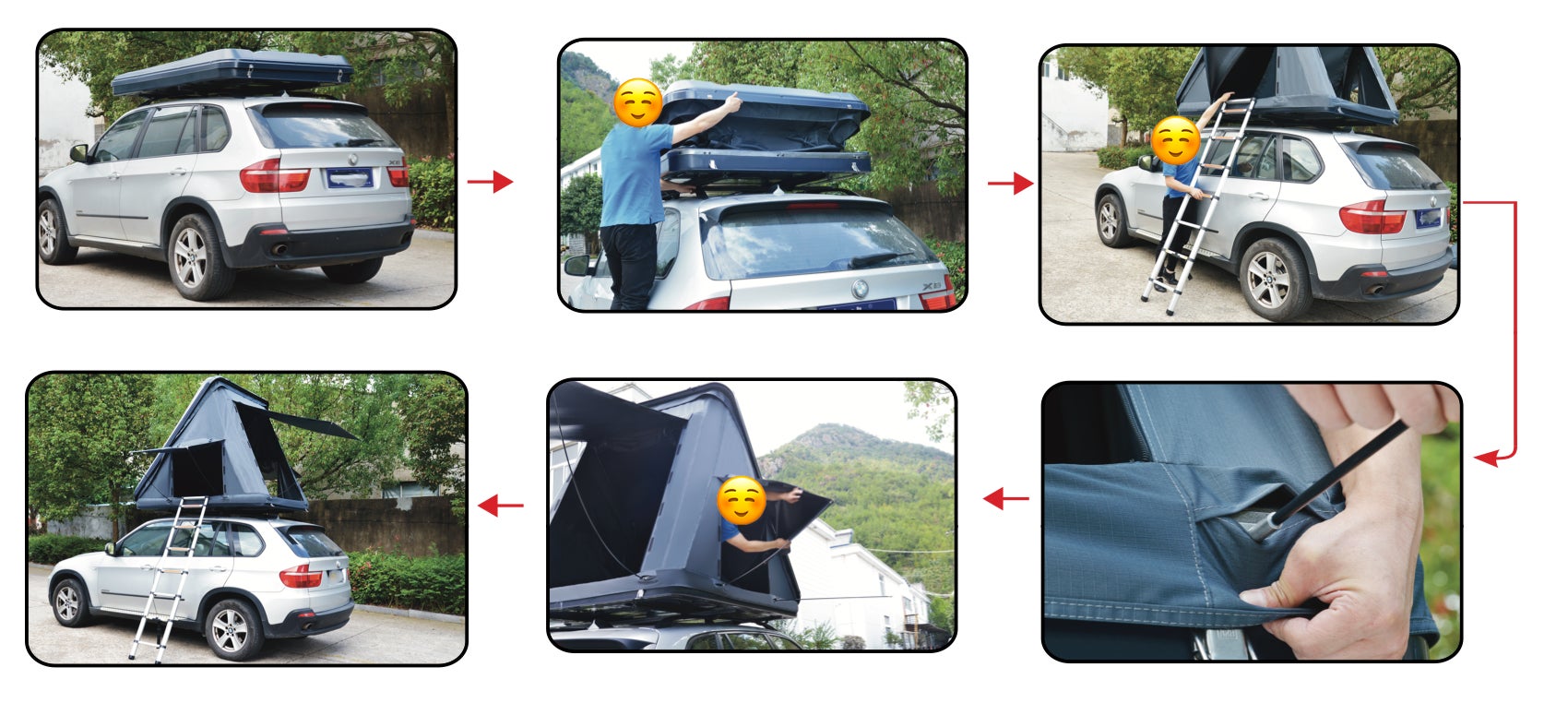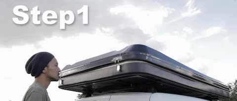 しかしルーフテントは下記のgifで表示しているような4ステップで約3分程度で組み立てることができるので、テント組み立ての煩わしさをなくすことができますよ。