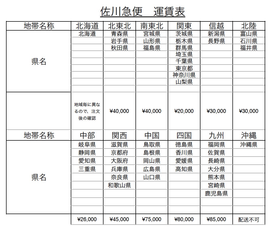 送料の料金表はこちらになります。お近くの佐川急便の営業所止めとなります。