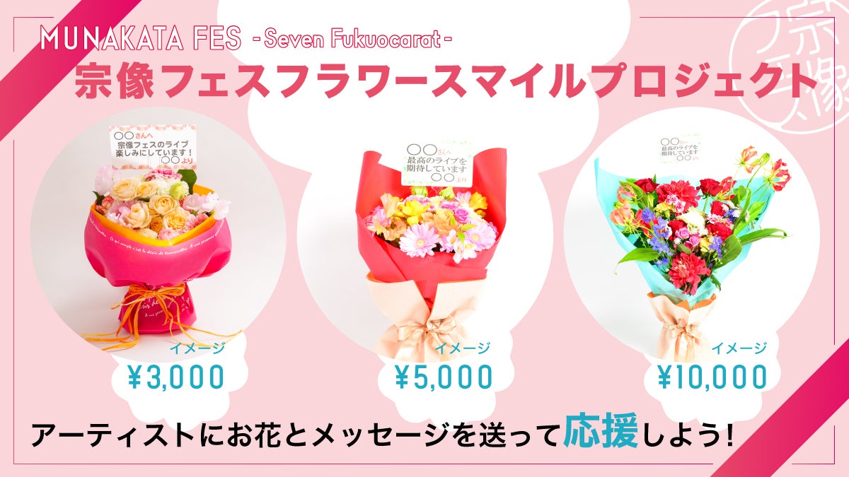 今回、宗像フェスでアーティストにお花を贈ろう企画を行いました。通常より日持ちする特殊な「宗像フェスファンタジーブーケ」をアーティストへ届けます。開催終了後、頂いたお花の全てを地域の幼稚園の園児に届けます。ファンの皆様の思いをアーティストに届け子供達を笑顔にする夢のあるプロジェクトです。