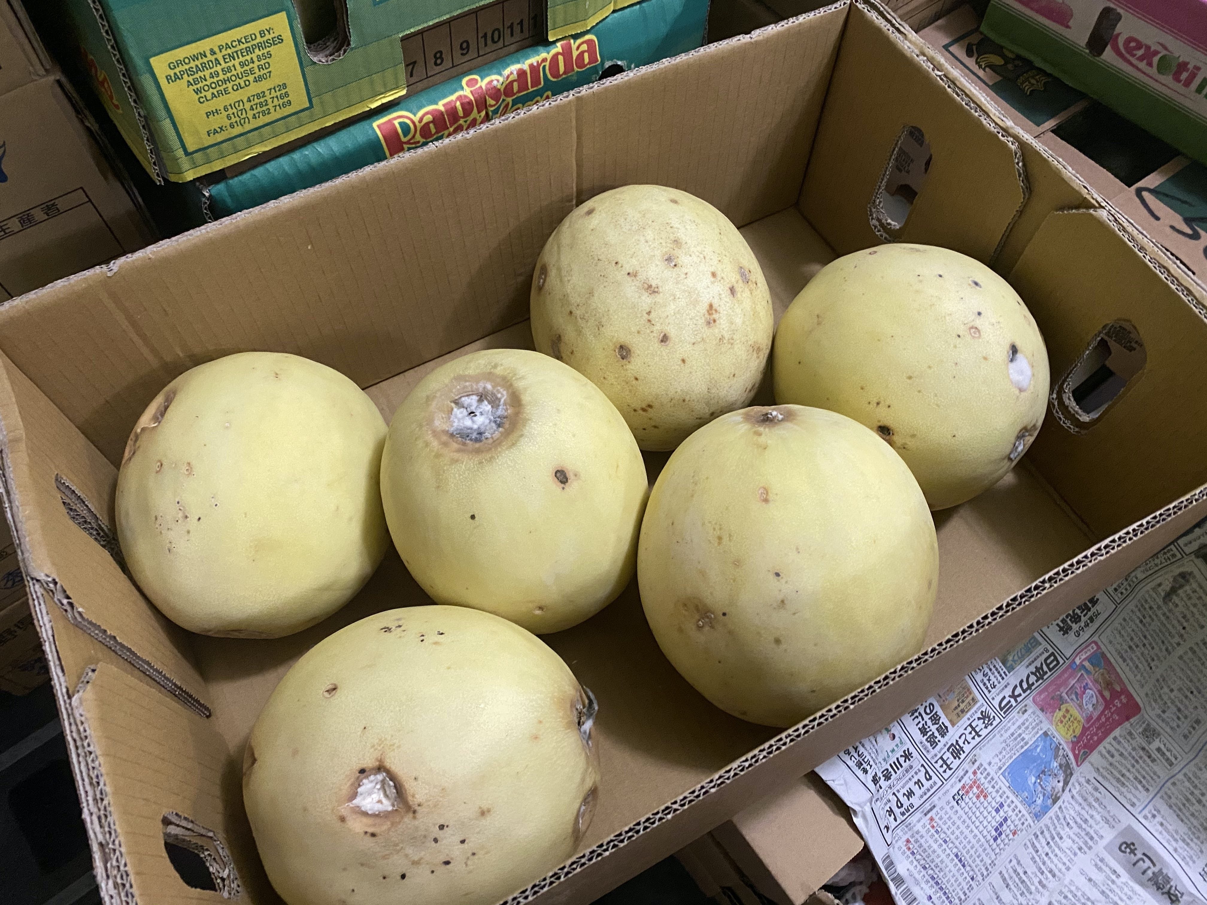 こちらは、商社から送られてきたものの、すでに星(茶色い斑点)が出てしまい、しばらく冷蔵倉庫で眠っていたハネジューメロンというメロンです。これくらい黄色っぽくなっているヤツは日本のメロンに負けないくらい美味しいんです!、、、がこれでは買い手はなかなかつかないですよね?