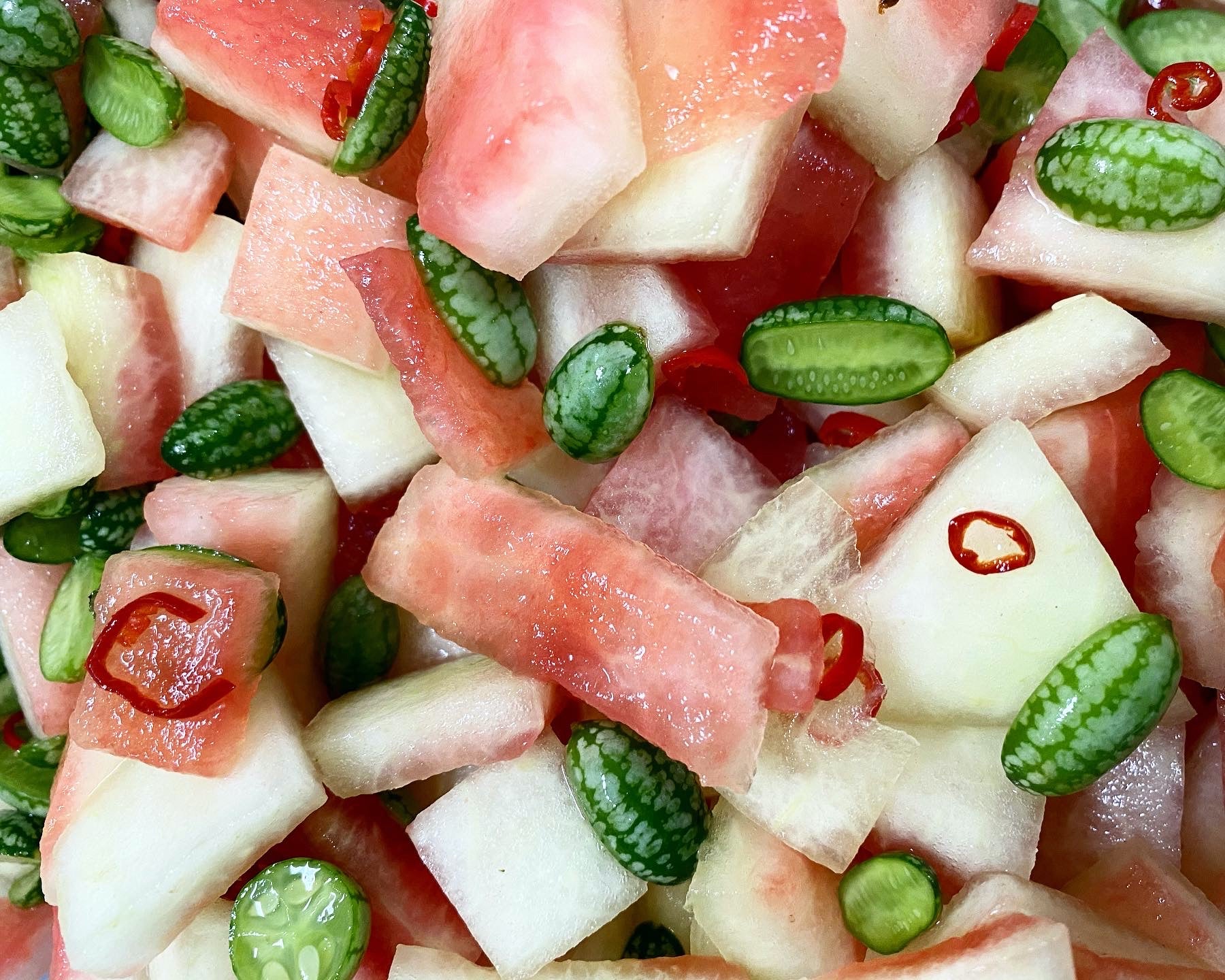 左の画像は「スイカの白い部分とマイクロきゅうりの浅漬け」です。スイカの白い部分は当然ながら、普通は皮と一緒に捨てられてしまいますね。でもここに意外に栄養価が含まれていて、生で食べると瓜っぽいのですが、浅漬けなどにするとまさにきゅうりのようにシャキッと美味しく食べられるのです!