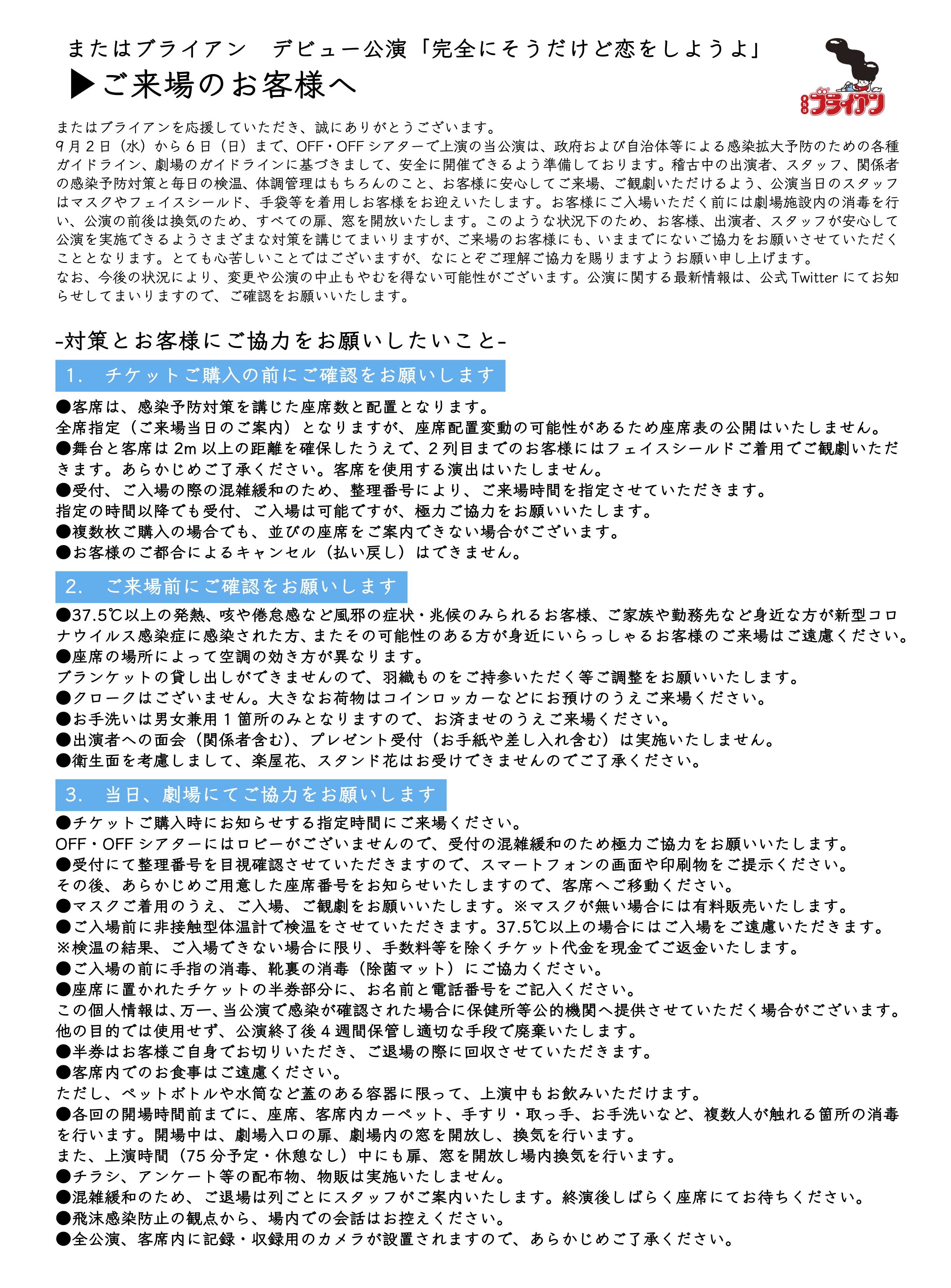 またはブライアン デビュー公演「完全にそうだけど恋をしようよ」▶︎ご来場のお客様へまたはブライアンを応援していただき、誠にありがとうございます。9月2日(水)から6日(日)まで、OFF・OFFシアターで上演の当公演は、政府および自治体等による感染拡大予防のための各種ガイドライン、劇場のガイドラインに基づきまして、安全に開催できるよう準備しております。稽古中の出演者、スタッフ、関係者の感染予防対策と毎日の検温、体調管理はもちろんのこと、お客様に安心してご来場、ご観劇いただけるよう、公演当日のスタッフはマスクやフェイスシールド、手袋等を着用しお客様をお迎えいたします。お客様にご入場いただく前には劇場施設内の消毒を行い、公演の前後は換気のため、すべての扉、窓を開放いたします。このような状況下のため、お客様、出演者、スタッフが安心して公演を実施できるようさまざまな対策を講じてまいりますが、ご来場のお客様にも、いままでにないご協力をお願いさせていただくこととなります。とても心苦しいことではございますが、なにとぞご理解ご協力を賜りますようお願い申し上げます。なお、今後の状況により、変更や公演の中止もやむを得ない可能性がございます。公演に関する最新情報は、公式Twitterにてお知らせしてまいりますので、ご確認をお願いいたします。
