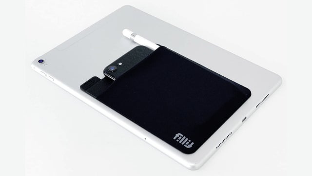 タブレットの背面にFillit Pocketを貼り付けてもOK!スマホやペンなど手にもって移動するアイテムを入れて持ち運ぶことができます。