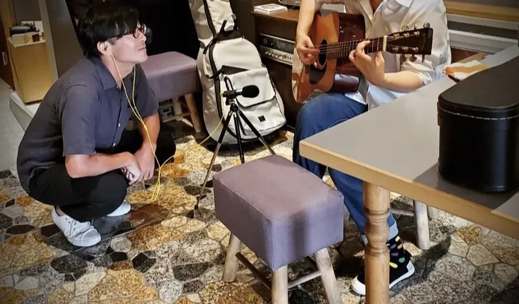 先日ご紹介したリターンのひとつ、西村周平さんによるBoutonオリジナルCDの制作には直方のバスの音やBoutonの中の音も入るのですが、最近夜主が2ヵ月前から始めたギターの音も録音することに。