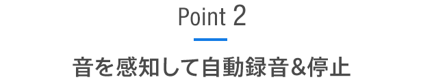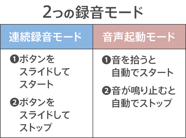 ワンタッチで簡単に録音スタートできるのはもちろんのこと、音を感知すると自動で録音がスタートするモードを選べます。