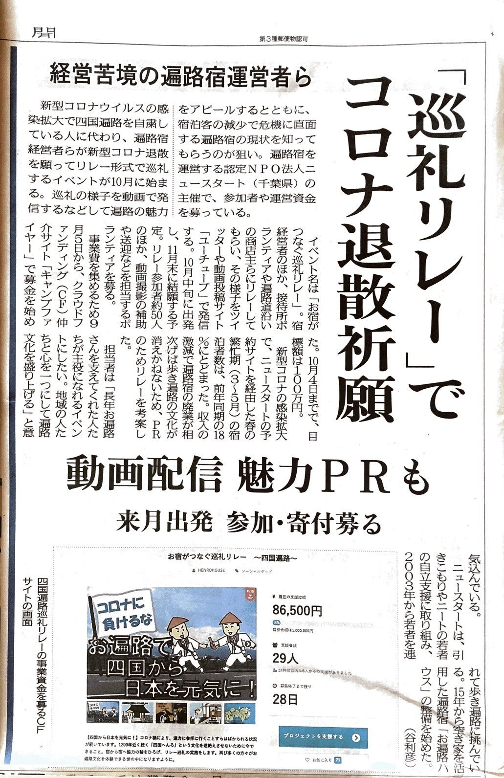 じわじわとPV数、リツイートなど伸びています。偏に皆さまのご協力のおかげです!昨日の徳島新聞朝刊にて、当プロジェクトについて取り上げて頂きました。かなり大きく紙面を割いてもらえたようです。今後も、さらなる注目を集められるよう、全力でアピール続けていきます。これからも応援よろしくお願い致します!認定NPO法人ニュースタート事務局お遍路ハウス運営本部名川 和清
