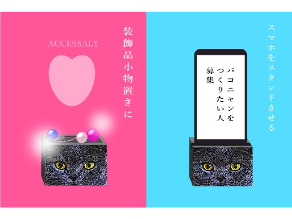 モノ猫「バコニャン」の制作に関わる活動、特に製品化、オリジナルアイテムの試作費用に充当させて頂きます。
