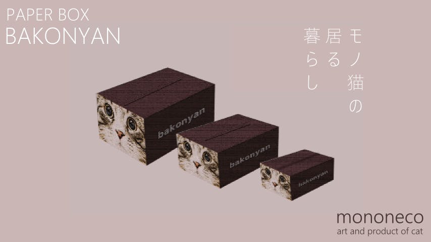 家猫のたたずむ姿やティッシュボックスに顔を突っ込んだり、狭い箱に同化するおかしな習性などをイメージし、ふと、日常の暮らしの中にある生活品と一体化、モノ化したら面白い…、というヒラメキから、愛猫の分身を作る、モノ猫バコニャンが生まれました。