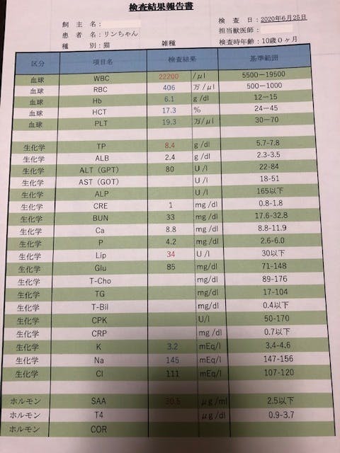 6月25日に総合病院へ着くと、体温が39.9度と高く、貧血、低カリウムと命の危険があるという事ですぐさま緊急入院となりました。体重も5月の初めは4.5kgあったのに3.5kgくらいまで減ってしまっていました。