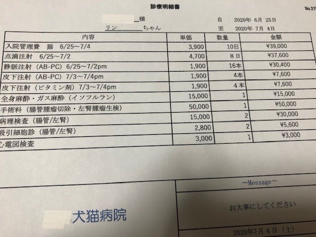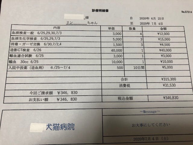 かなり弱っていた事と大手術、大掛かりな検査をした事で35万ほどかかってしまいました。