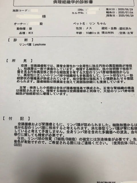 食欲が落ち始め何度も主治医に通いみていただいたのですが改善せず、遠方の総合病院へ転院したところリンパ腫という病気であることが発覚しました。