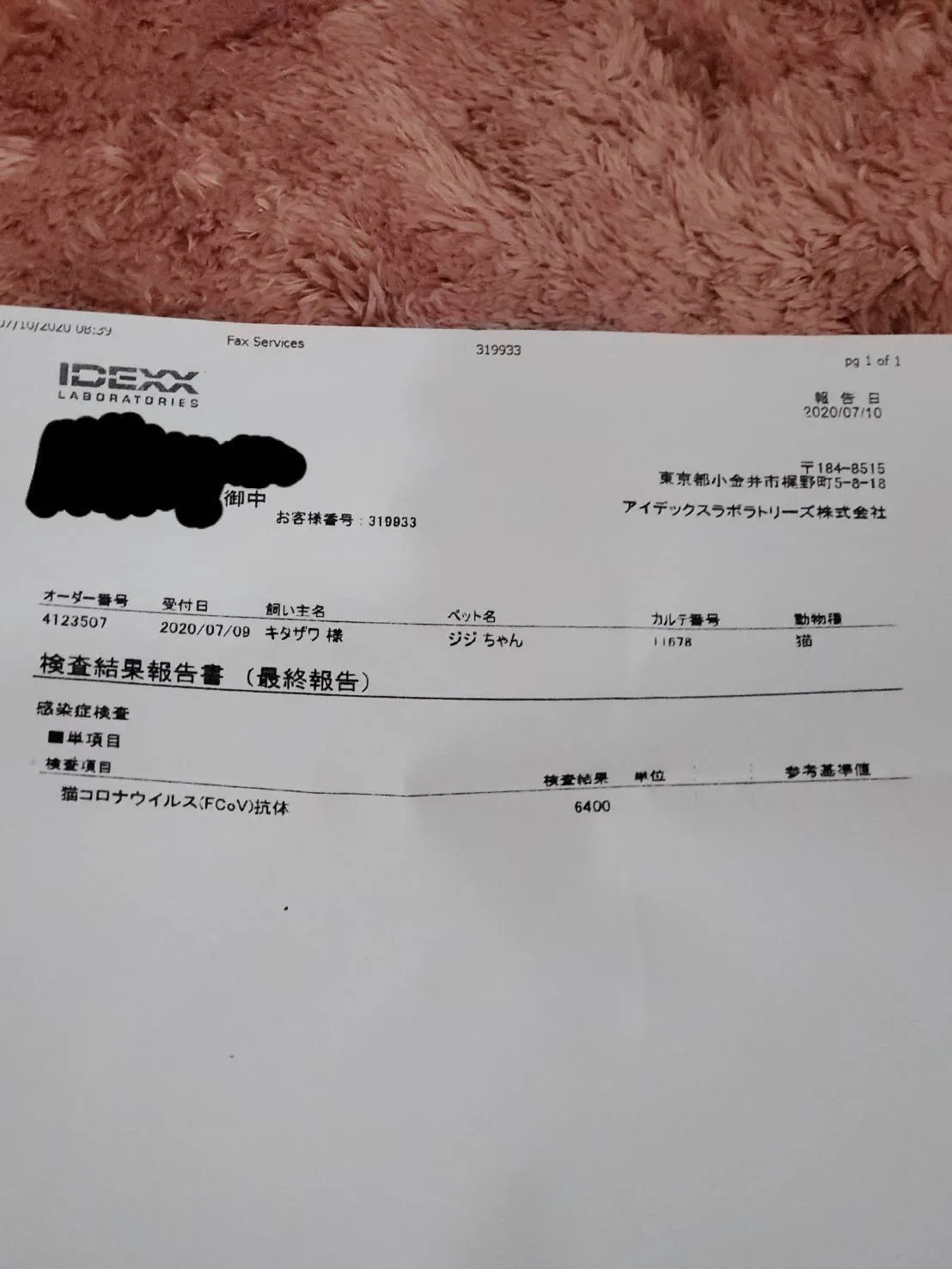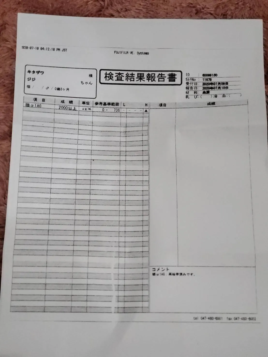 成長期であるにも拘らず体が大きくなるどころか体重減少、ここ数日みるみると食欲・元気がなくなっているジジに気づき、2020年7月9日に病院へ連れて行ったところ、体の粘膜に黄疸が見られるため危険な状況であることは確かであるとの診断。体重はわずか2.4㎏にまで落ちておりました(3ヶ月程前までは3.0㎏)。猫伝染性腹膜炎(FIP)の可能性が非常に高いとの見解にて、外注の血液検査を行ったところ、翌日7月10日にFIPでほぼ間違いないだろうとの結果をお電話にていただきました。