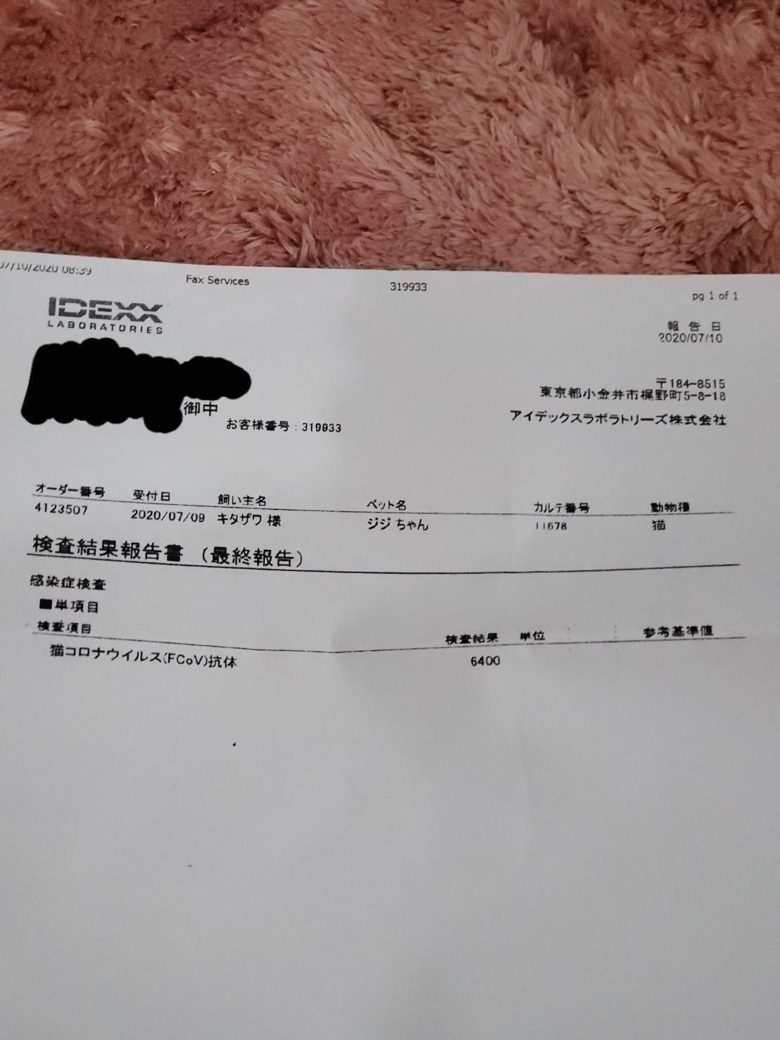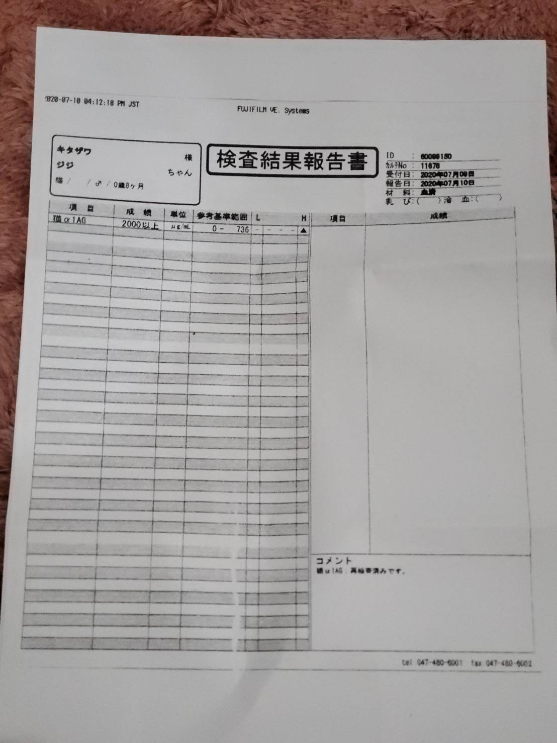 成長期であるにも拘らず体が大きくなるどころか体重減少、ここ数日みるみると食欲・元気がなくなっているジジに気づき、2020年7月9日に病院へ連れて行ったところ、体の粘膜に黄疸が見られるため危険な状況であることは確かであるとの診断。体重はわずか2.4㎏にまで落ちておりました(3ヶ月程前までは3.0㎏)。猫伝染性腹膜炎(FIP)の可能性が非常に高いとの見解にて、外注の血液検査を行ったところ、翌日7月10日にFIPでほぼ間違いないだろうとの結果をお電話にていただきました。