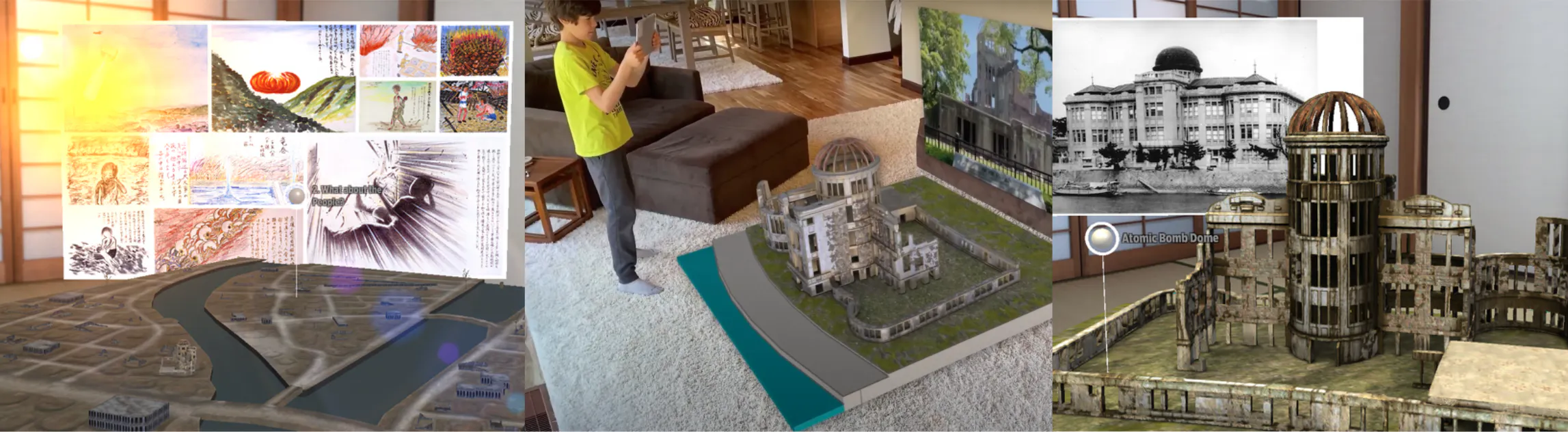 目の前に平和公園が出現し、被爆前の町並み、人々の暮らし、被爆の実相、被爆証言、被爆後の復興のストーリーを視聴できるアプリです。