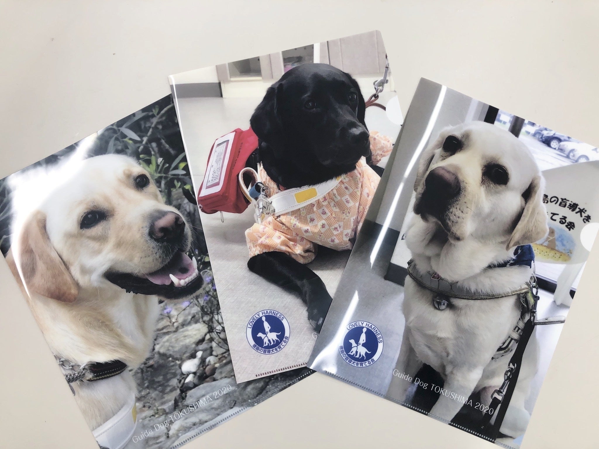現在活躍中の盲導犬「ディア」「ウーゴ」「エヴァン」のクリアファイルです。A4サイズいっぱいに写真をプリントしており、手前味噌ですがなかなか素敵なデザインですよね☆