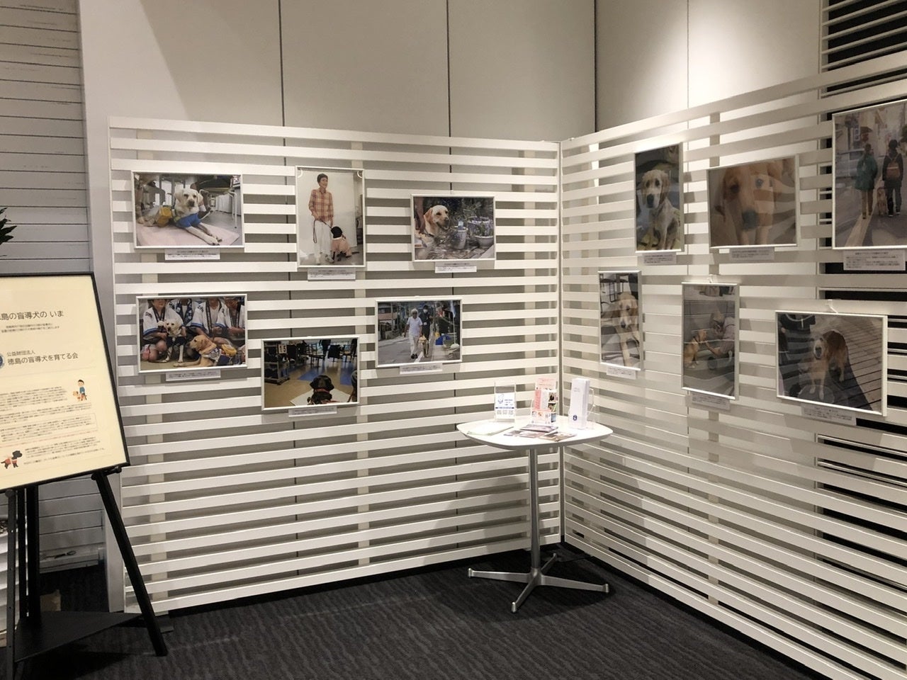 こちらは地元の阿波銀行 福島支店様内のギャラリーコーナーで、銀行へお越しの皆様にお手続きの合間などにご覧いただけるようになっています。ありがたいことに利用料は無料(ありがとうございます!)ですので、当会の盲導犬やパピーの最近の様子を大きめにプリントし掲示しました。この費用もこれまでに頂戴したご寄付を元に作成しておりますので、出来るだけ安いところを探してプリント&額縁を購入しました。製作費は約2万円です。