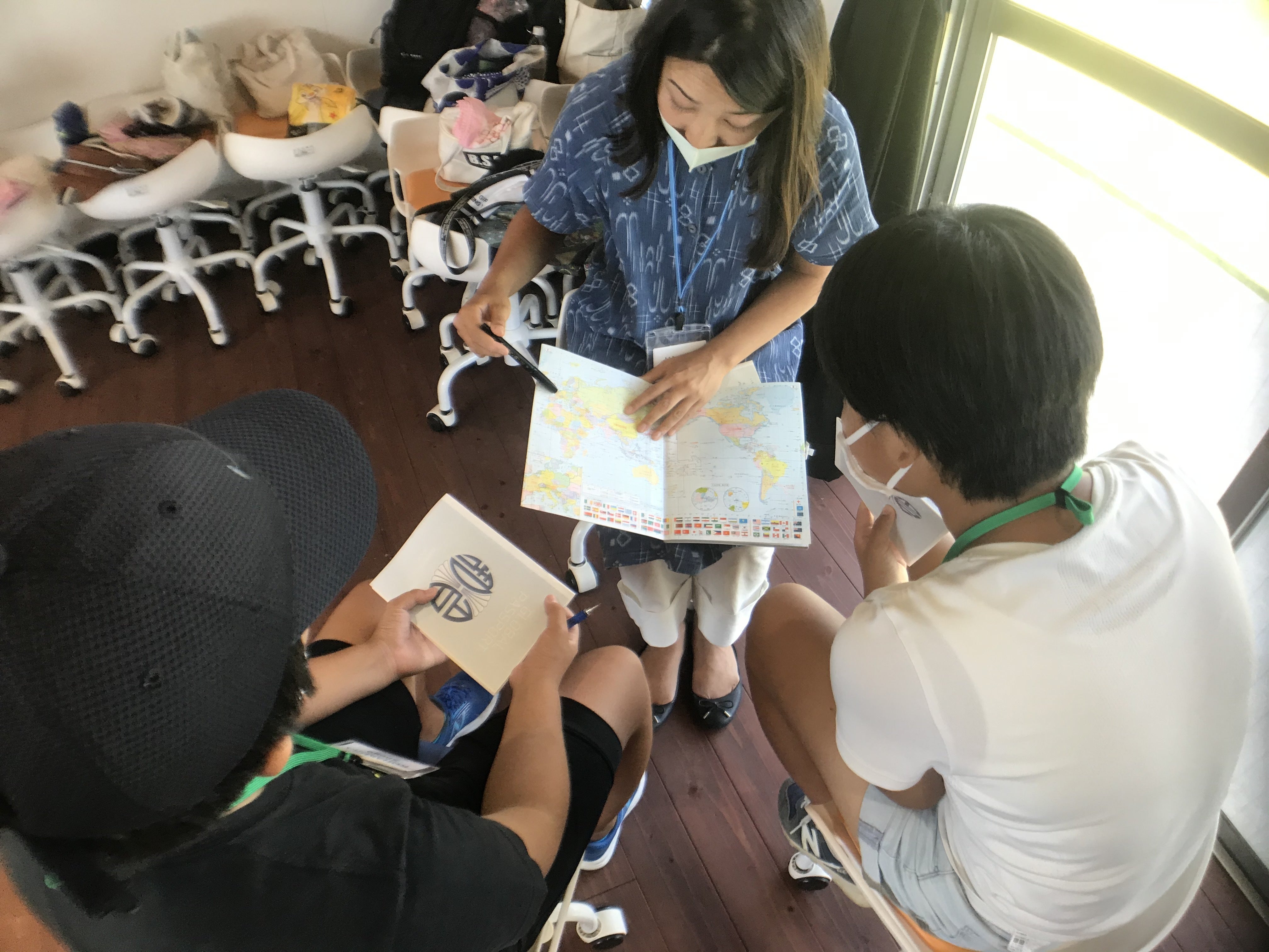 こうしてスタートしたグローバルキャンプ。午前中のメインアクティビティは「世界を知る」ワークです。2~3人の小グループにわかれて、それぞれの国の特徴や文化を知り、体験しました。