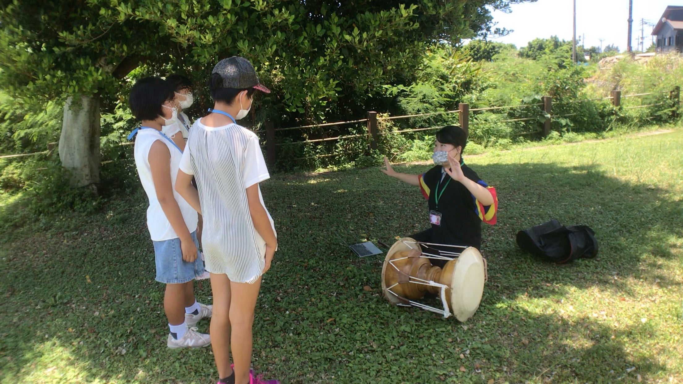 韓国語を担当してくれたTaeちゃんは、韓国の伝統的な打楽器「チャング」を披露してくれました!五穀豊穣を願う演奏の中で雨を表現しているというチャング。韓国の音楽や楽器は、沖永良部でもなじみの深い沖縄のエイサーにも似た雰囲気で、琉球文化を持つ沖永良部とのつながりが自然と感じられます。みんなもチャングを叩いて、踊って、楽しんでいました。