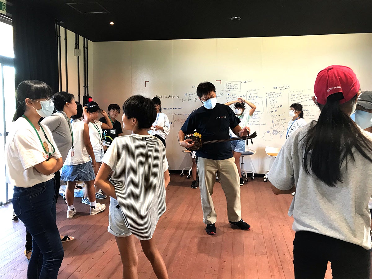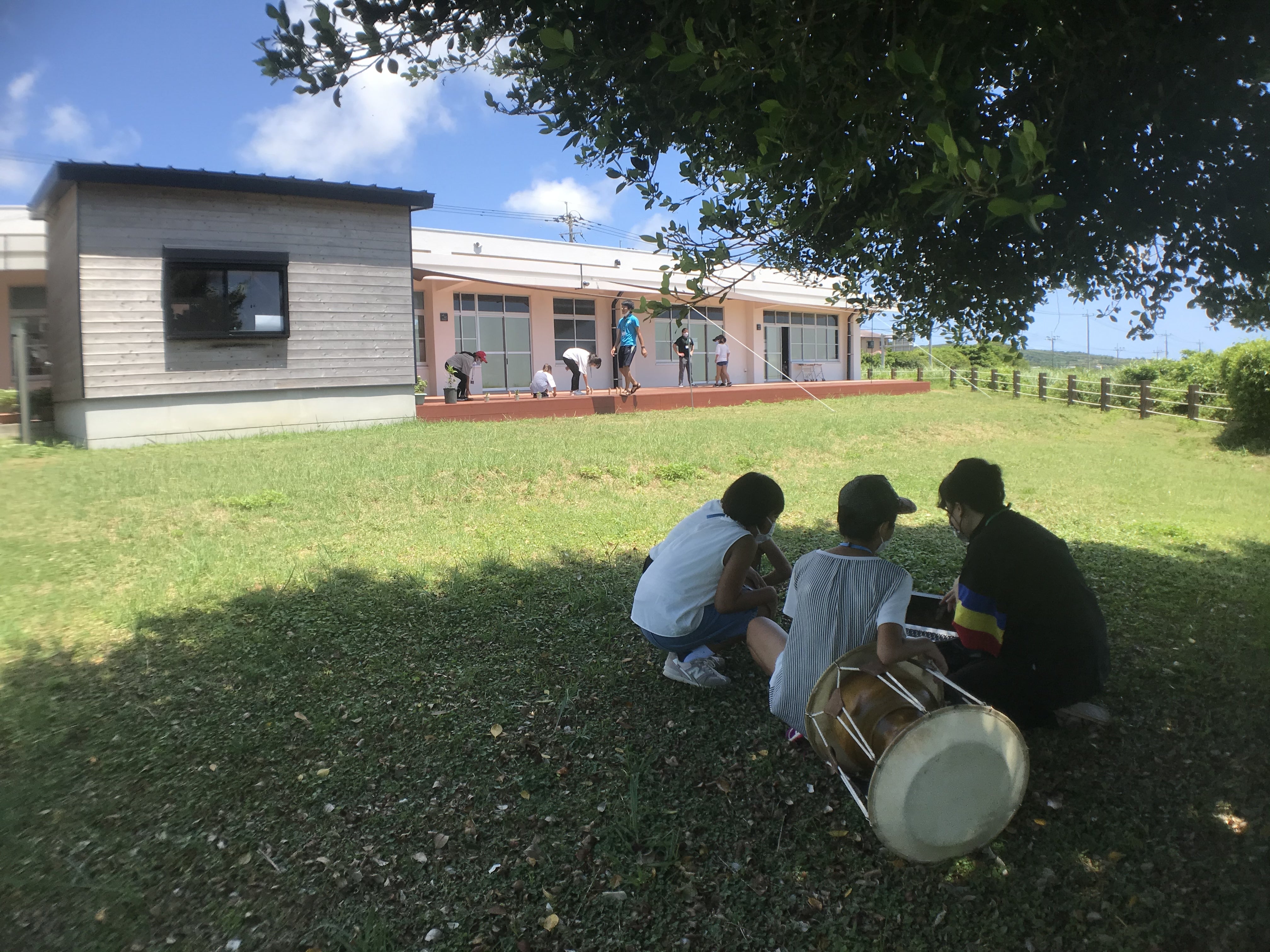 生涯学習課から榮鉄也さんが三味線を持って駆けつけてくれました。三味線を練習してる子たちにも演奏に加わってもらって、みんなで島唄「えらぶゆりの花」を歌い、踊り、ビデオレターを彩ります。