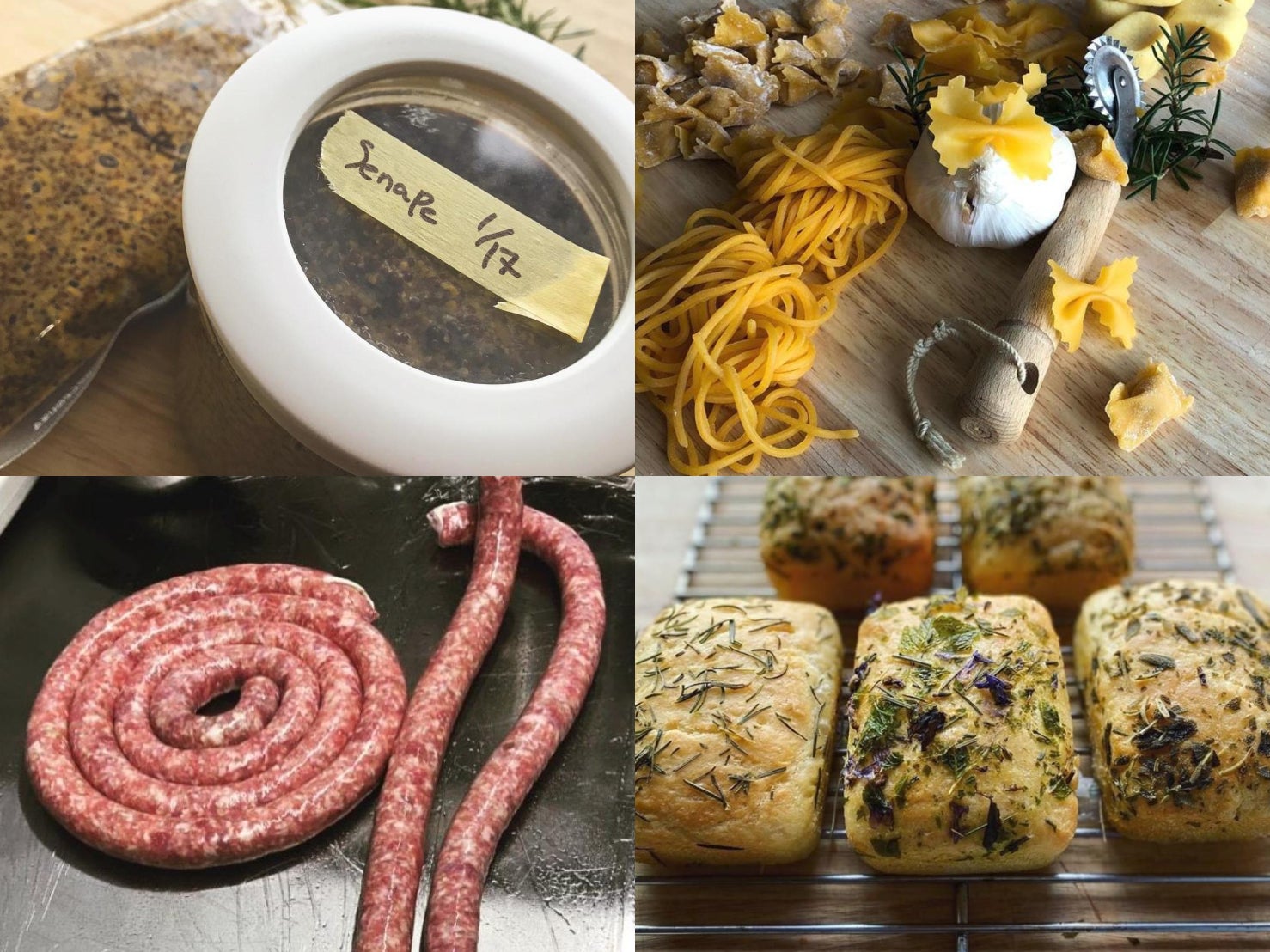 調味料(写真はマスタード)、パスタ、ソーセージ、フォカッチャなど、全て1からの手作りです。