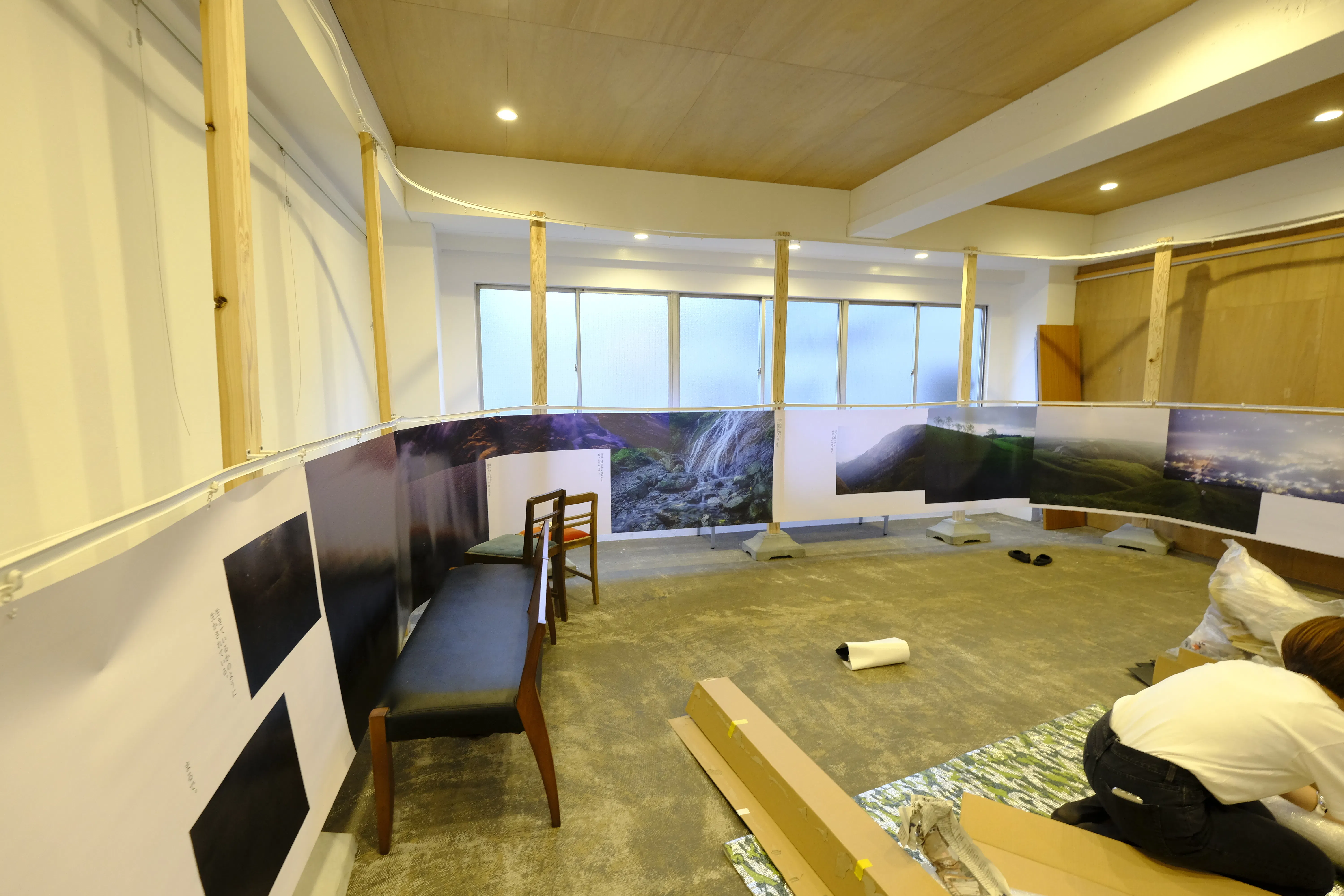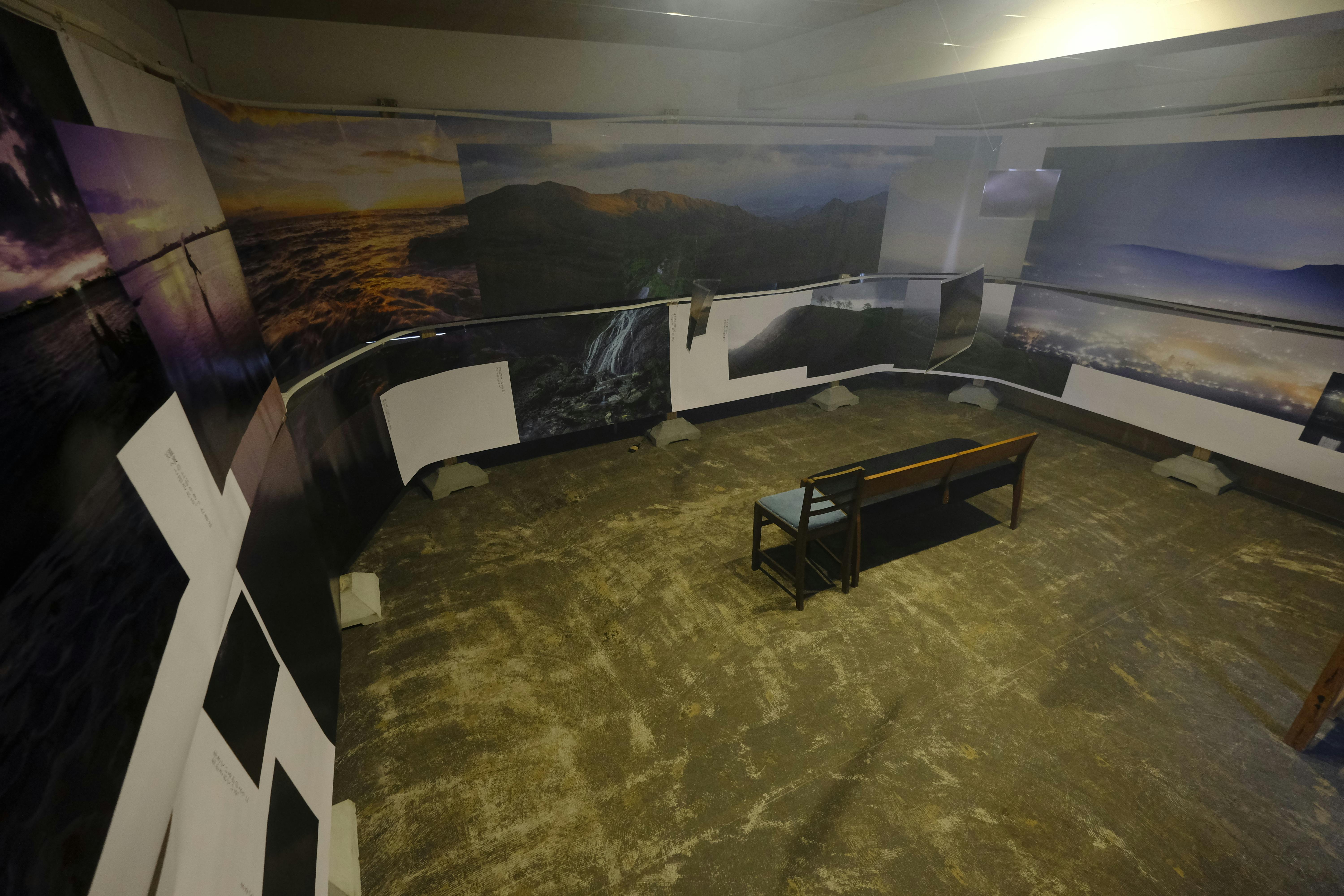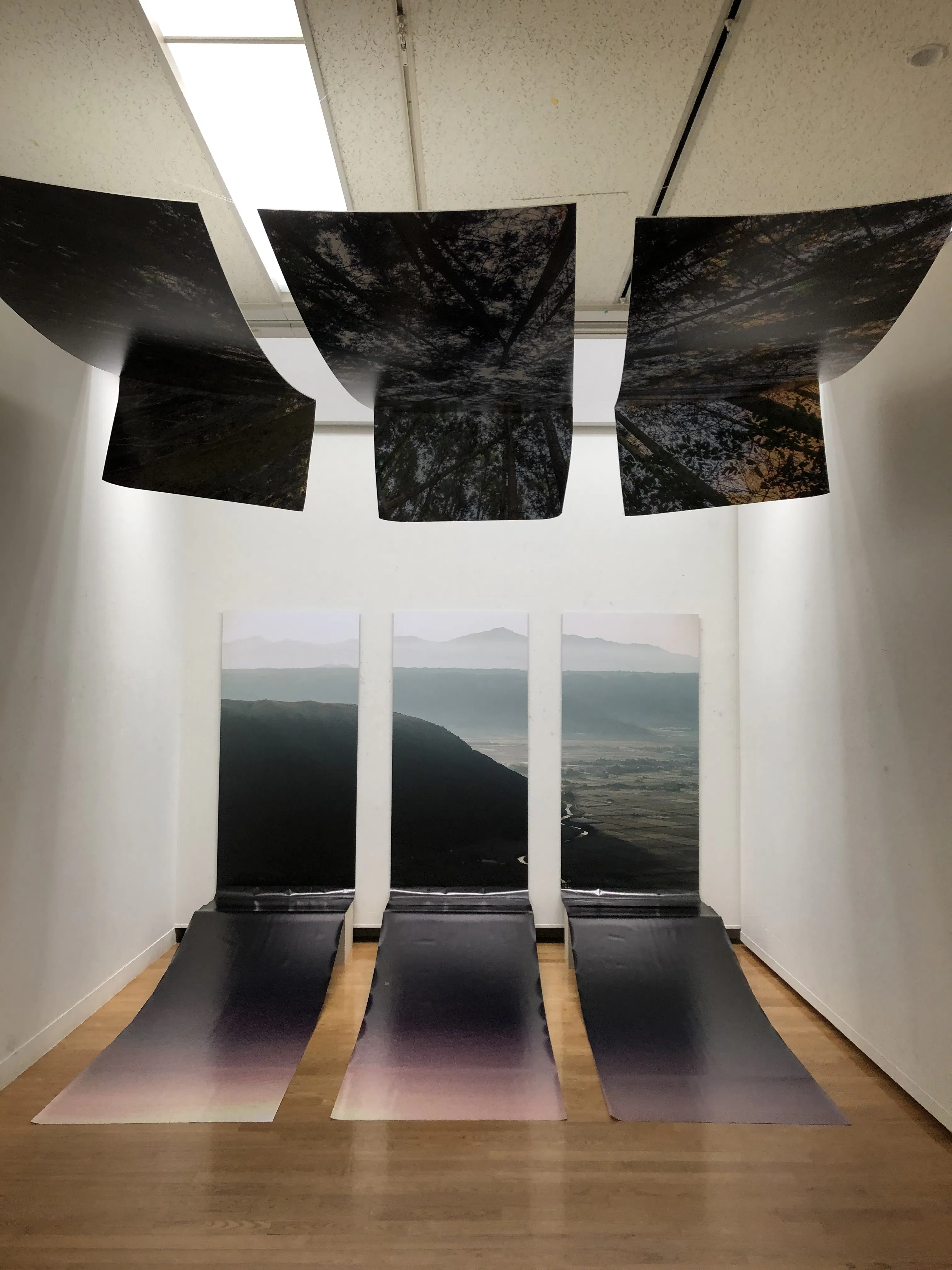 今までと一貫し、見た人が写真の中に入る様な感覚になってもらいたく900×2000のパーツを三枚で一枚の写真を構成し、天井、壁、床を使用し展示。