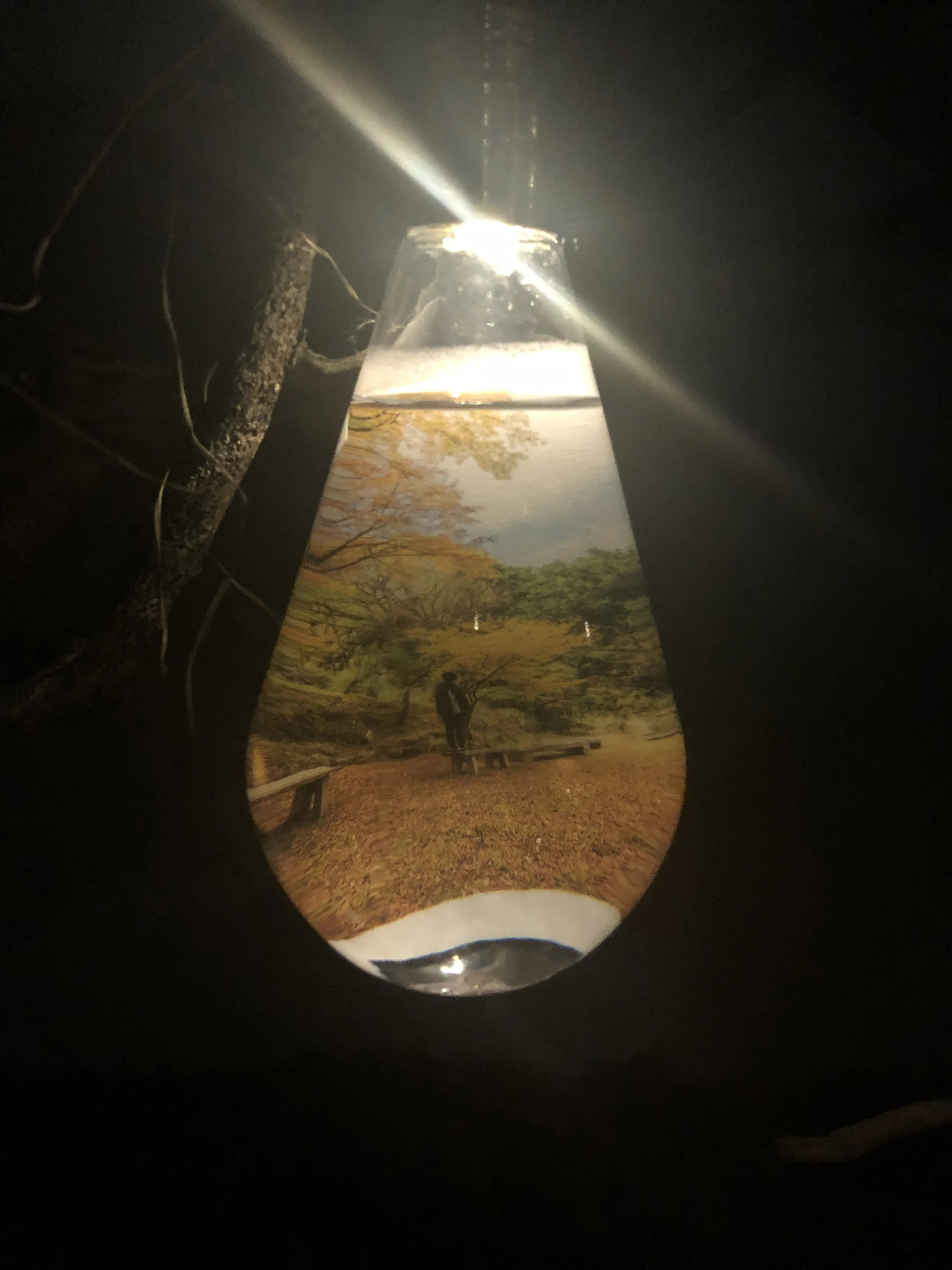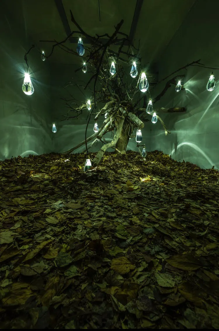 福岡県中洲で開催した個展。マンションの一室に現れた大樹に吊り下がる木ノ実一つ一つに詰め込まれた写真に新世界が生まれる場所のイメージで会場をレイアウト。森と海をテーマに離れた場所のイメージの二つの場所は意外と近く、隣接しているのではないか。という考えで企画構想。