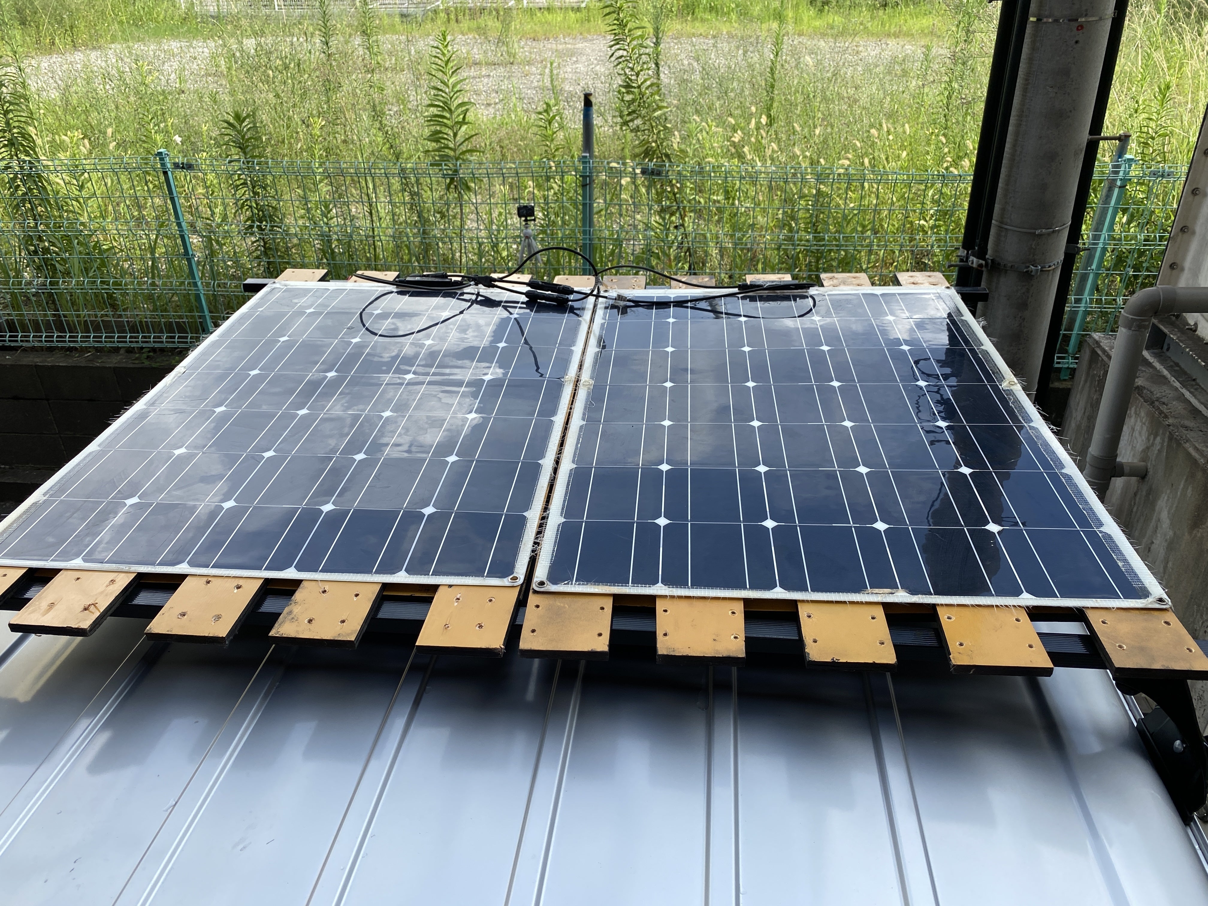 どうもこんばんは!忢刄です!前回の旅に引き続き、今回もソーラーパネルを活用し、電力の確保を試みます。こちらが前回の様子。時間も知識もなかったので、屋根に直接貼り付けました。実際に使用してみると、ソーラーパネルが受けた熱が密接している車の屋根をつたい車内に温度が上がる事が考えられました。そして、空間を開けた方が、電力変換効率も上がるとの情報も仕入れました。という事で先日制作途中だったスノコを作りました!とりあえず以前も投稿したカット済みの木材。それらを組み合わせマジックテープを貼り付けパネルを装着!今回はルーフキャリアを使用し、車体とソーラーの空間を開ける。ポールとスノコを結束バンドで固定途中ポールが折れるというアクシデントも発生しましたが、うまくできたかな。って感じです!まだまだ発電量や、ケーブルの取り回し、サブバッテリーの配置など実験要素は山盛り、、楽しんでいきましょう!!それでは!!