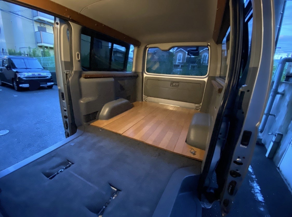 年式や走行距離はそこそこいっているのですが、なんとラッキーなことに前の所有者も車を改造するのが好きみたいで車内にはカーテンレールや木材が残ったままに!
