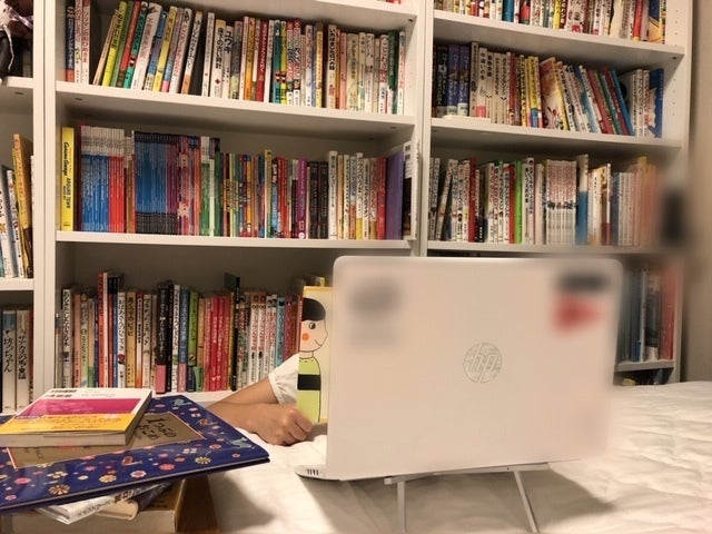 少し遠方の年長さんから、ZOOMでお話しがしたいというご依頼をいただきました。本が大好きな女の子(Aちゃん)ということで、お互いのおすすめ本の紹介をしあいっこしました。うちも本はたくさんあるのですが、Aちゃんの家にもとてもたくさん本があり、何十冊と紹介してくれました。同じ本があるととても喜んでくれて、私が紹介して気になった本は、後日読んだ感想を報告してくれました。本の紹介だけで1時間以上もZOOMしていました。その後の本の片づけが大変だったことは言うまでもありません!本のあらすじや、どの場面が好きだとか、どの登場人物が好きだとか、どのセリフが好きだとか、相手に伝わるように話すのは思ったよりも難しかったですが、相手に伝える練習になるなと思いました。次のご依頼をいただいたので、内容をAちゃんと相談中です。※パソコンのステッカーにモザイクをかけています。