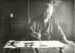 世界的有名な棟方志功画伯(筆菩薩:絵画上)、現代書道の父 比田井天来先生(写真上)を始め多くの方との深い交流により、よりよい筆への追及に没頭しました。