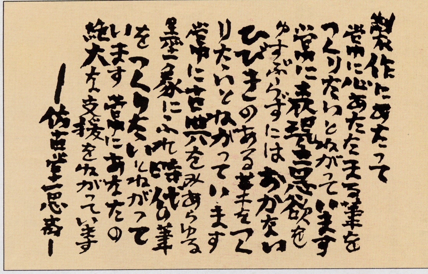 2代目井原思斉(しせい)が自ら筆で遺した「製作にあたって」は創業当初から変わらず、現4代目も承継しています。