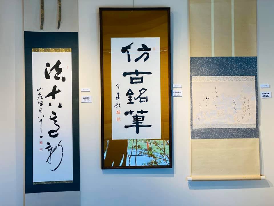当社仿古堂本店に併設 熊野町観光案内所「筆の駅」 にて仿古堂 創業120年企画展partⅡ が始まりました!期間:2020年9月21日(月)〜2020年 10月10日(土)今回の展示は昭和・平成時代に仿古堂に御縁をいただいていた先生方の墨跡を展示しています。メイン画像は...弊社のロゴである比田井天来先生の【仿古銘筆】奥様である比田井小琴先生のかな書(右)今上陛下 学生時代の書の先生、桑原翠邦先生の書(左)他、多種多様に渡る先生方の作品が並んでいます。本来であれば今日は筆まつりですが残念ながら中止となってしまいましたのでなかなか観に来てくださる方は少ないかもしれません。実際の作品は紙と墨の味わい深さまで鑑賞できます。実際に観ていただきたいと思うその一つは...かな料紙。かな料紙(りょうし)とは日本のかな(仮名)を書くために作られた装飾された用紙。一言では語れませんが、様々な技法で装飾されるかな料紙は、日本古来からの優美、優雅、品をあらわしている「日本の美」そのものです。その他版画家の棟方志功画伯の版画ではなく書-「いろはにほへと...」洋画家の中川一政画伯の絵ではなく書-「文房四宝の始祖」←タイトルですここからは50音順にてご紹介上田桑鳩(うえだ そうきゅう)宇野雪村(うの せっそん)小川瓦木(おがわ がぼく)金子鷗亭(かなこ おうてい)金子卓義(かねこ たかよし)榊 莫山(さかき ばくざん)鈴木翠軒(すずき すいけん)高木聖鶴(たかぎ せいかく)田中塊堂(たなか かいどう)連休最後の日、この写真を通して皆様にとって癒しの鑑賞となりますように…クラウドファンディングは明日の夜までお蔭様で目標達成後もご支援いただいております。本当に本当にありがとうございます!