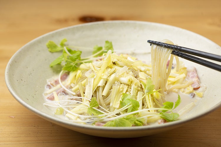 豆乳にベーコンのうまさを移してそこに生姜のワンポイントがうまさをひきたてます。