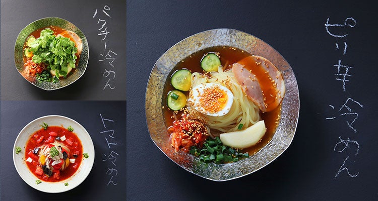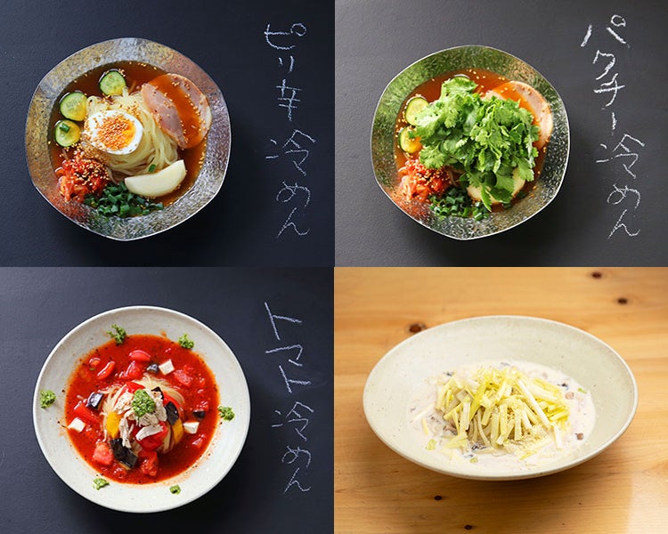 定番ピリ辛冷麺+パクチー冷麺+トマト冷麺+プレミアお任せ麺(うに、アワビ、ロブスターなどを使用した月替わりの麺)