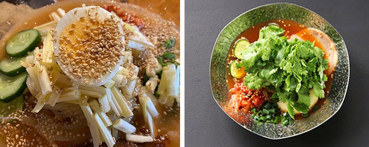あっさりだしに独特な食感の盛岡冷麺を岡山の自慢の農産物である岡山黄ニラ、岡山パクチーが彩を加える、まさに岩手県×岡山県の最強コラボ冷麺になっています。