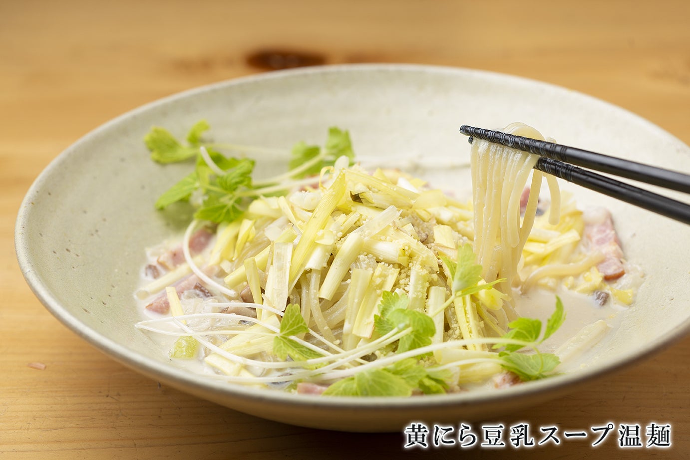 やわらかい風味の黄ニラとクリームスープのようなあたたかな豆乳があわさった商品です。