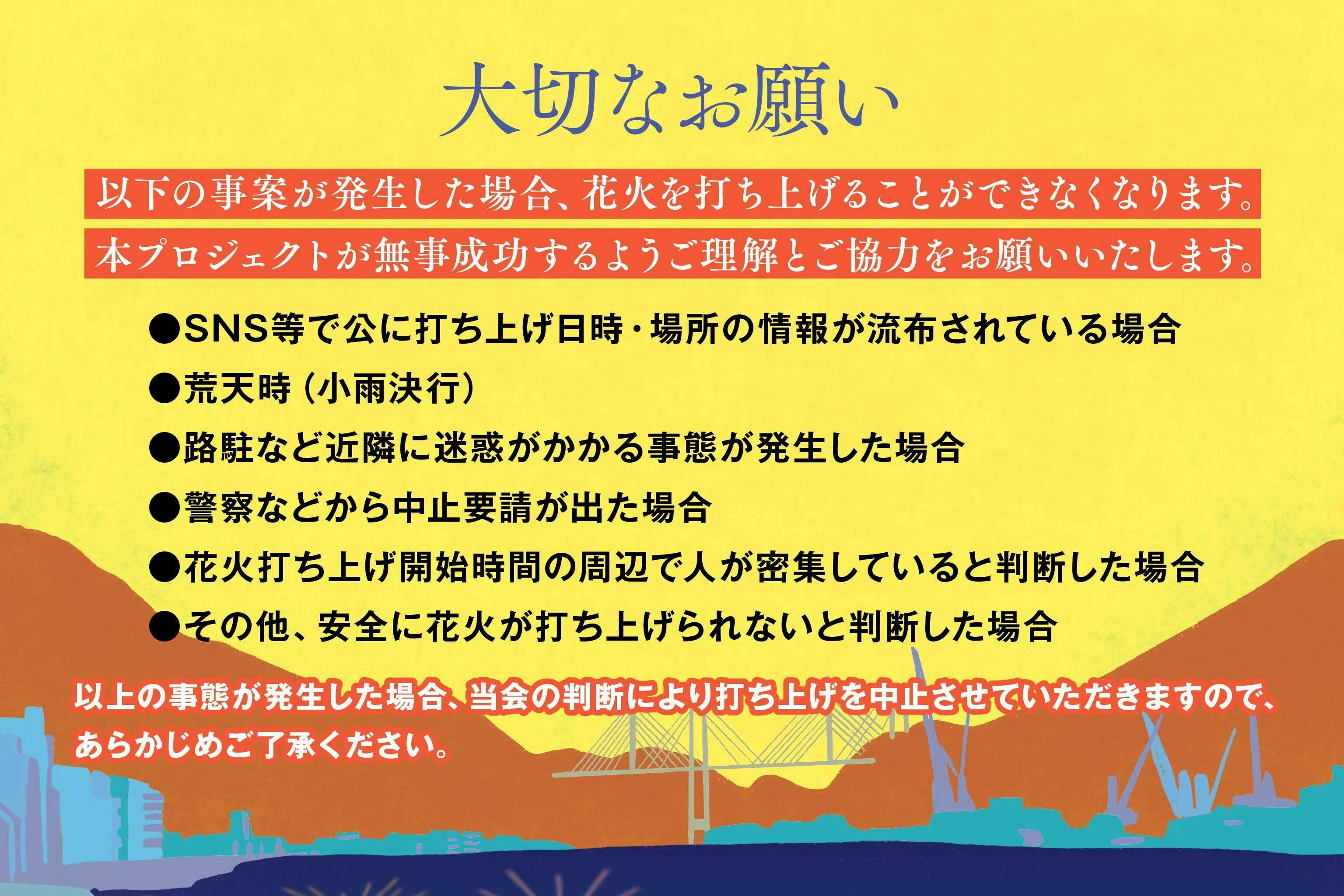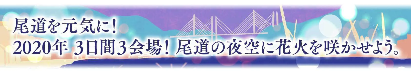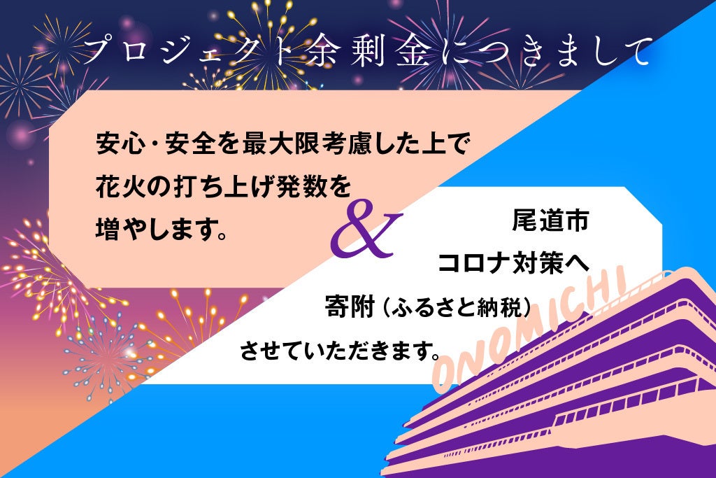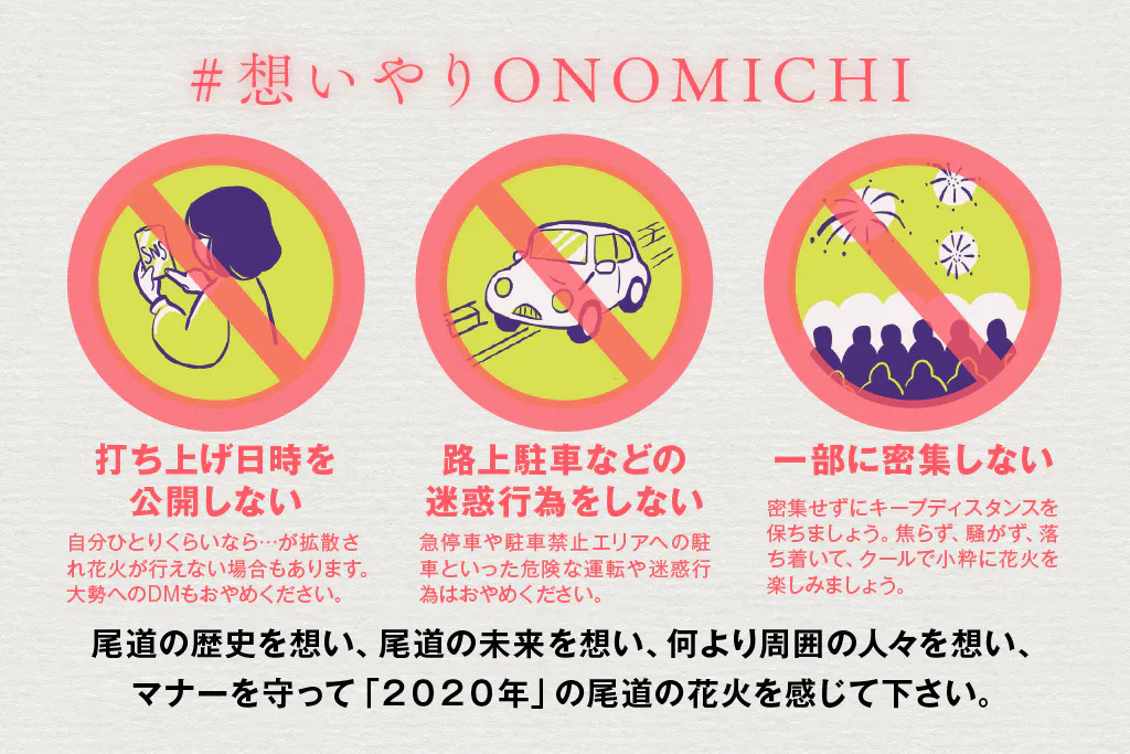 尾道にまた笑顔があふれて欲しいという思い、また元気な尾道が戻ってきて欲しいという願い、このコロナ禍が過ぎ去り平穏な日常を取り戻せるようにという祈りを込めて、2020年を楽しい思い出を残して、2021年に希望が持てる花火を打ち上げましょう!