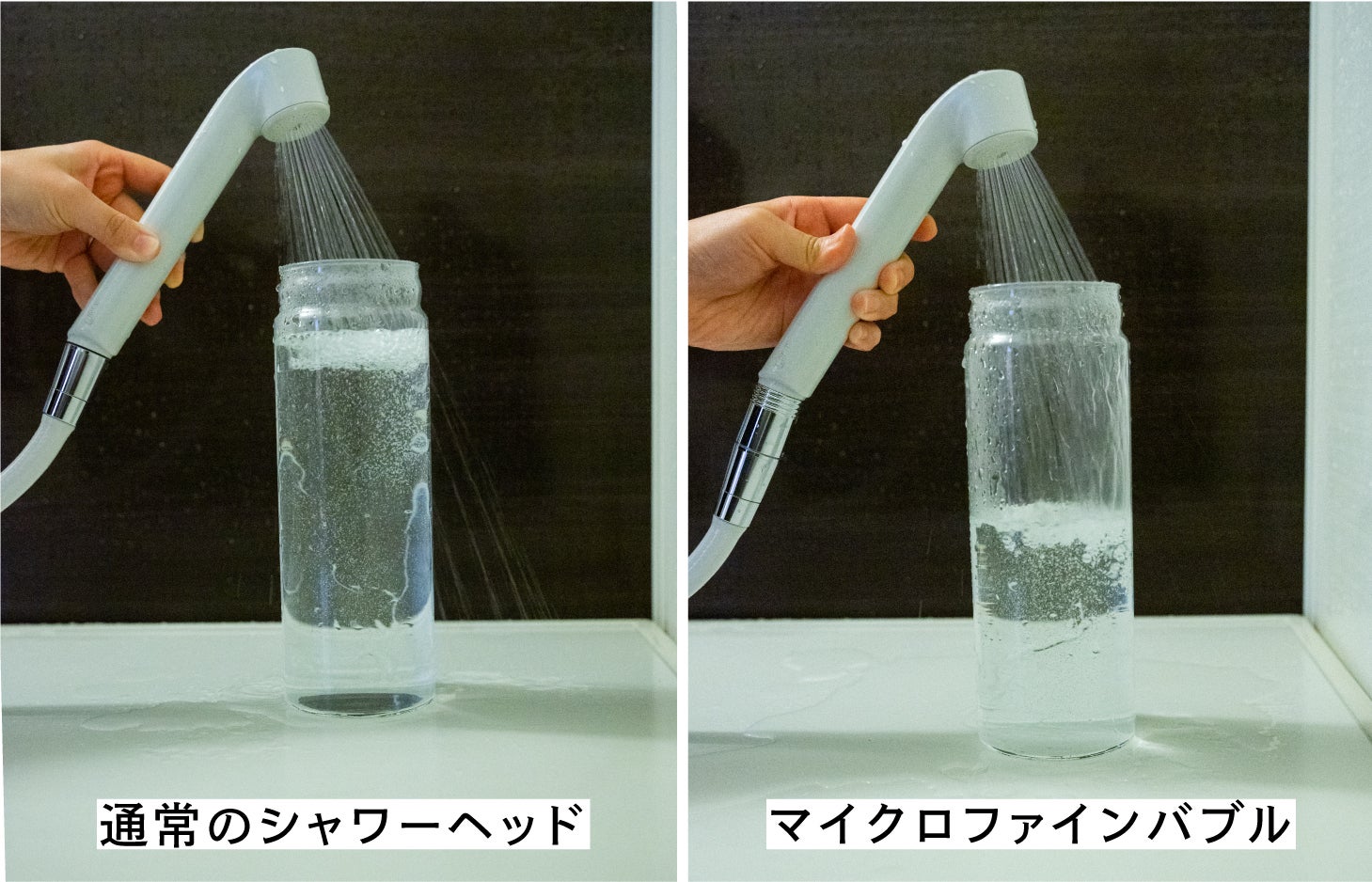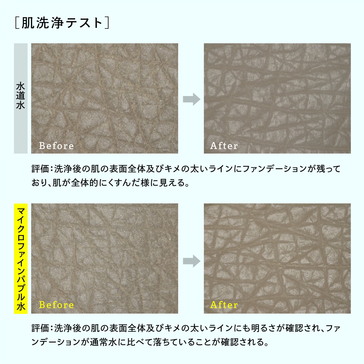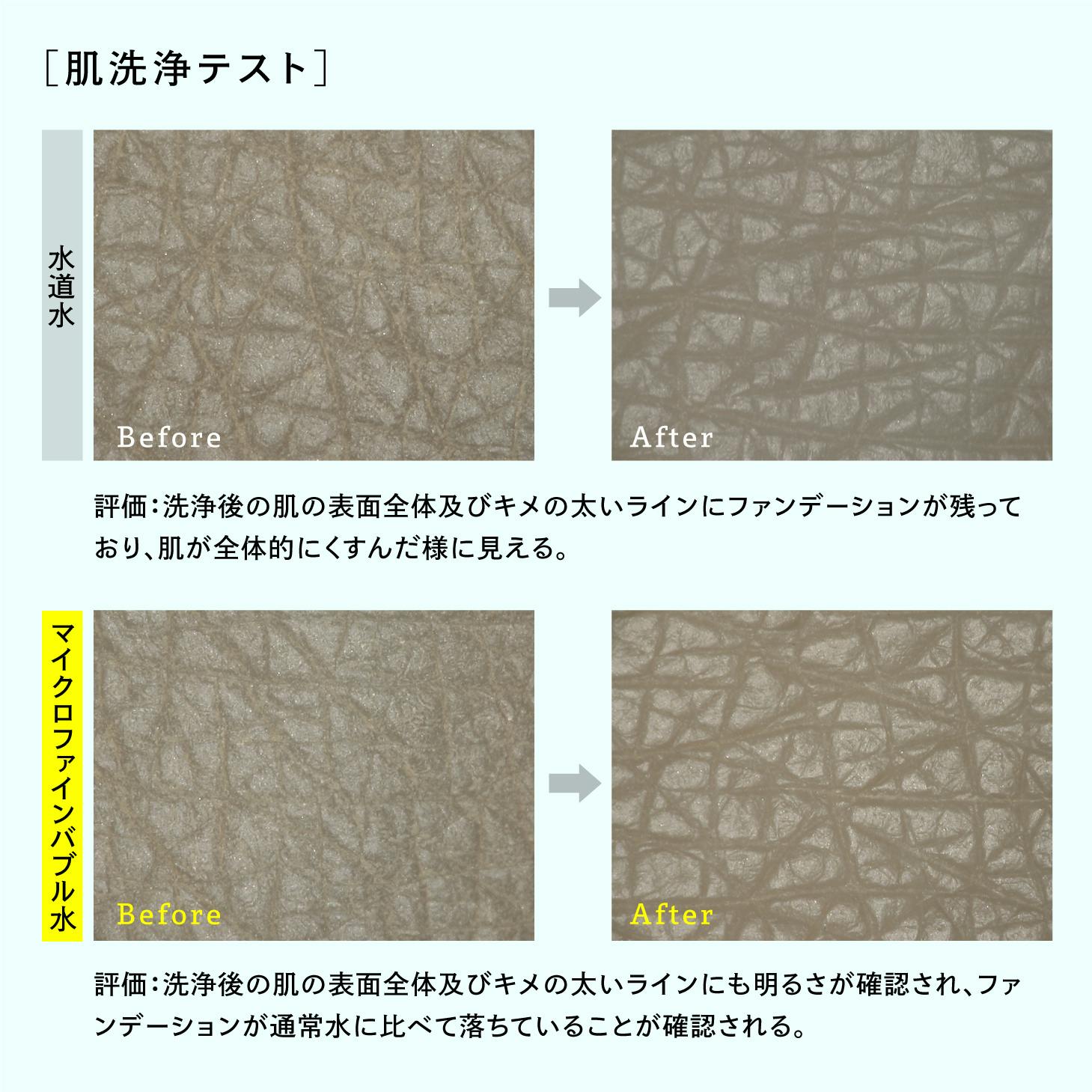 マイクロファインバブルアダプターで発生した超微細な気泡は毛穴よりも小さいため、毛穴に浸透し隅々まで汚れを洗い流してくれます。ファンデーションの洗浄力テストで10秒間水流を当てたところ、ファンデーションが水道水に比べてすっきり落ちました。