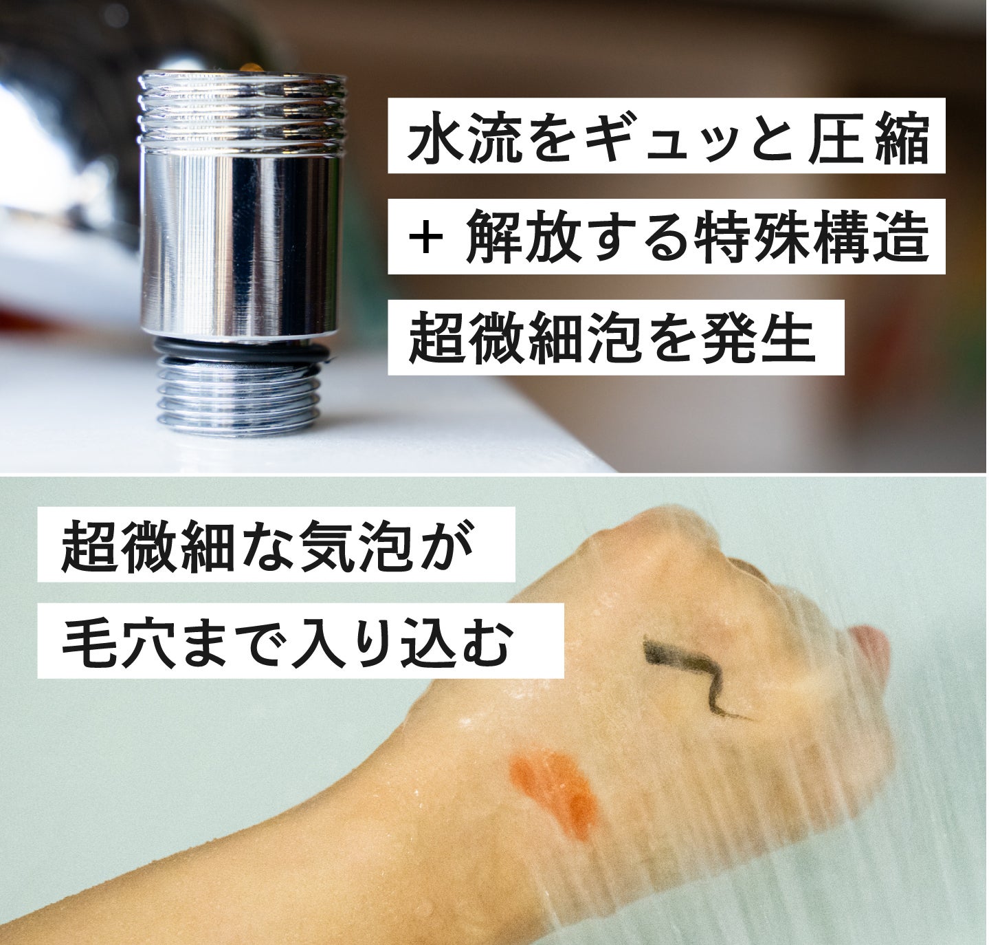 一般の水道水中には、目に見えない微細な気泡が存在します。その中でも、0.1mm以下の目に見えないほど小さな気泡のことを「マイクロファインバブル」と呼び、一般の水道水中には、目に見えない微細な気泡が存在します。その中でも、0.1mm以下の目に見えないほど小さな気泡が、毛穴より小さな泡なので洗浄力を高めてくれるのです。