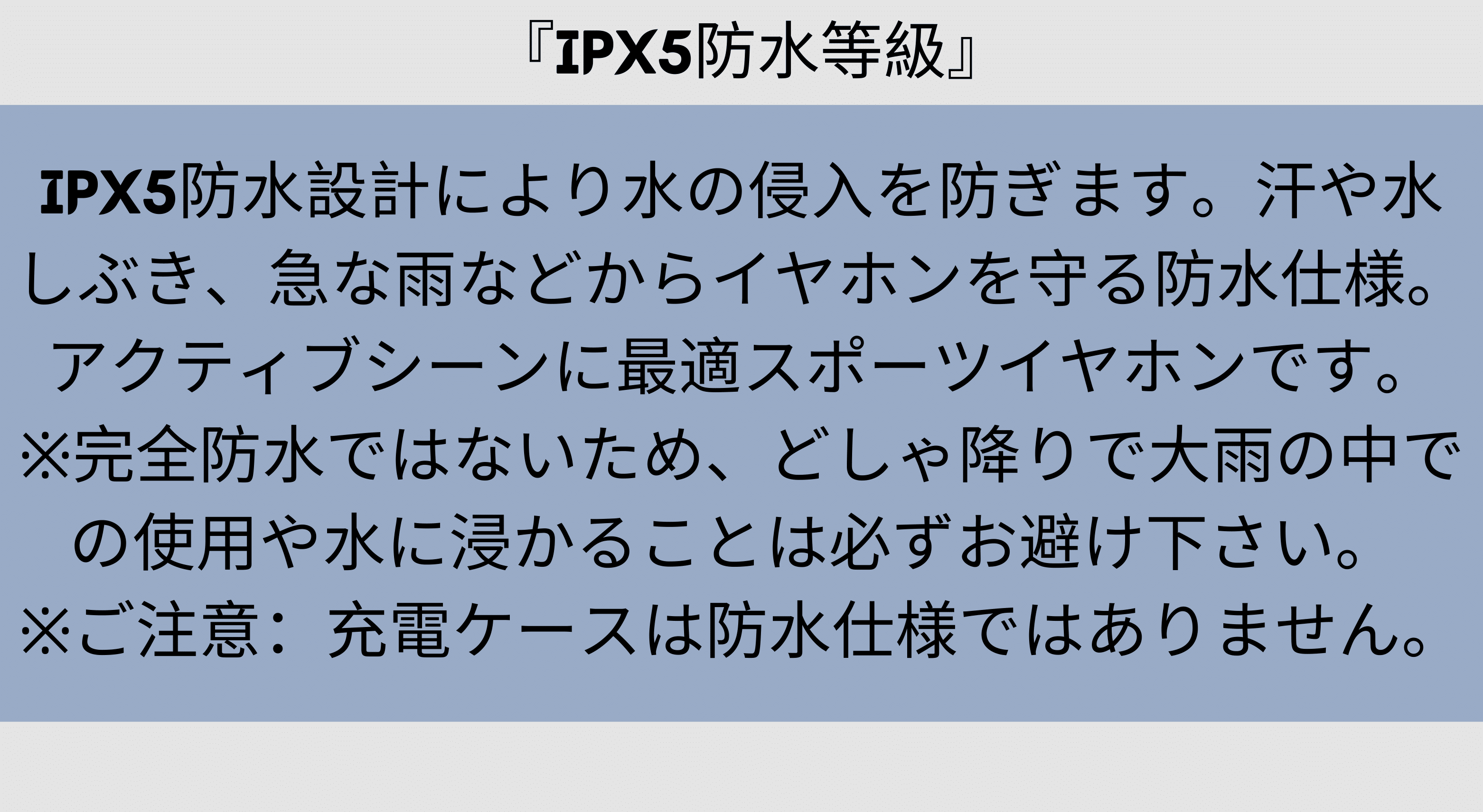 A1:IPX5防水設計により水の侵入を防ぎます。汗や水しぶき、急な雨などからイヤホンを守る防水仕様。 完全防水ではないため、どしゃ降りで大雨の中での使用や水に浸かることは必ずお避け下さい。 ※ご注意:充電ケースは防水仕様ではありません。