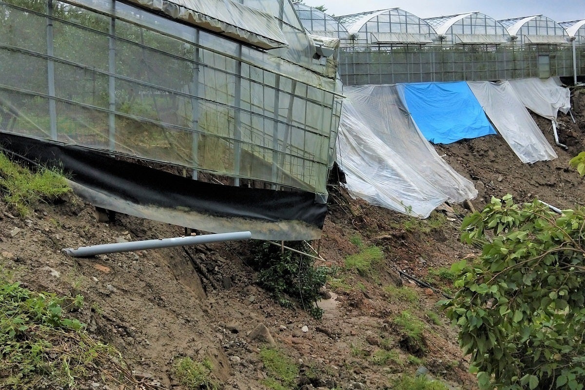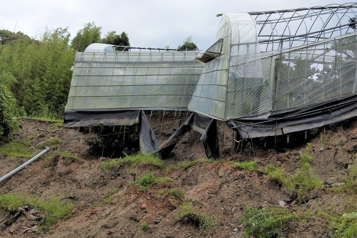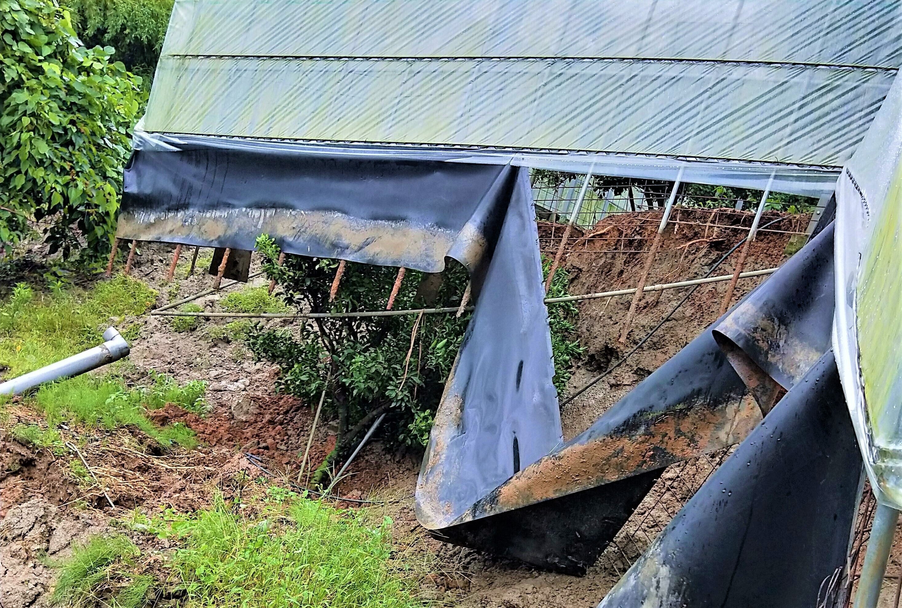 しかし今月6日より降り続いた集中豪雨により私達の大切に育ててきたミカン園が大きな被害にあってしまいました。ビニールハウスの裏手が大きく土砂崩れし、畑の中まで崩れてミカンの木も一緒に流されてしまいました。