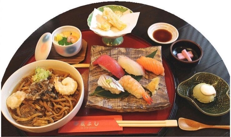 黒石名物、【つゆ焼きそばがついたセット】・嶽きみ天ぷら(旧いわき町の嶽地方で取れるトウモロコシの天ぷら・お寿司・旬のもの等・・・