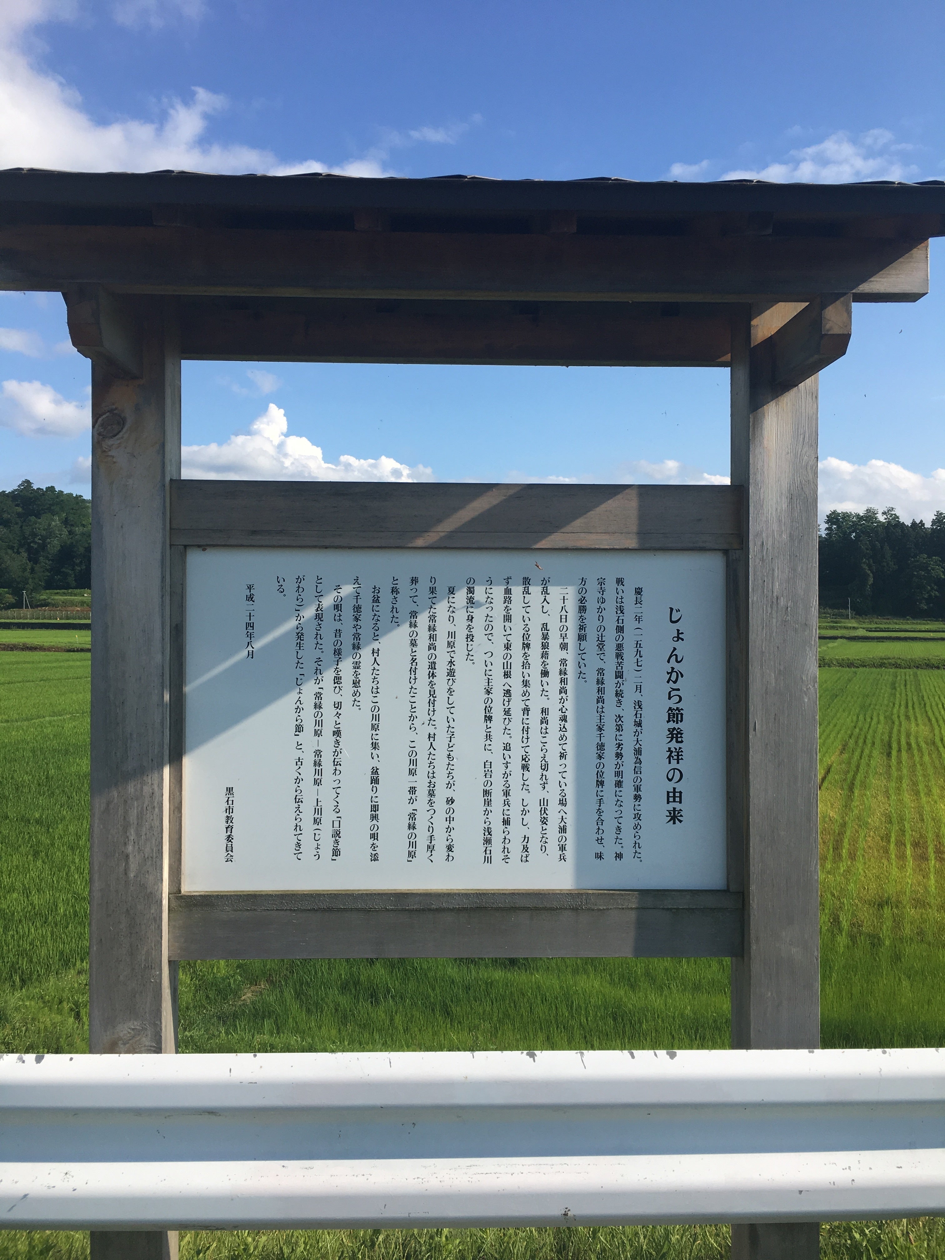 和尚はその1年後下流で発見され部落民の手でねんごろに埋葬されました。部落民は、千徳公の悲運を嘆き、常縁和尚の名を借りて唄った口説節が「じょんから節」で、発祥の地だと伝えられています。常縁和尚の墓は河原近くの墓地にあり。浅瀬石の民謡家鳴海亀太郎氏により、