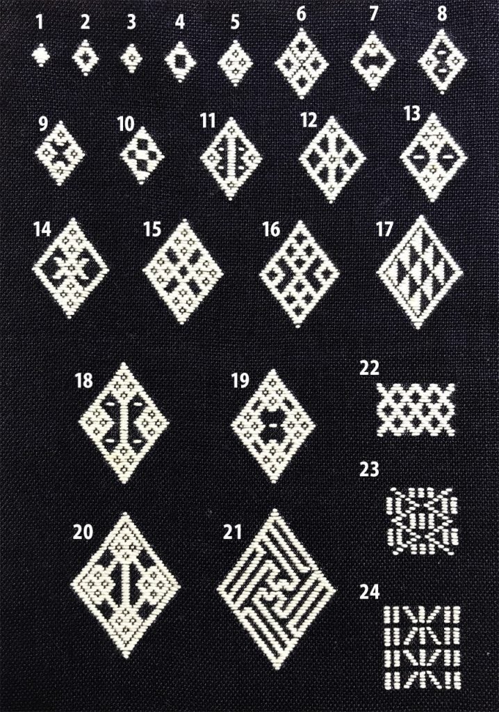 こぎん刺しの基礎模様は「モドコ」と呼ばれ、現在40種類ほど存在します。これらを巧みに組み合わせることで、より大きく美しい幾何学模様が生み出されます。