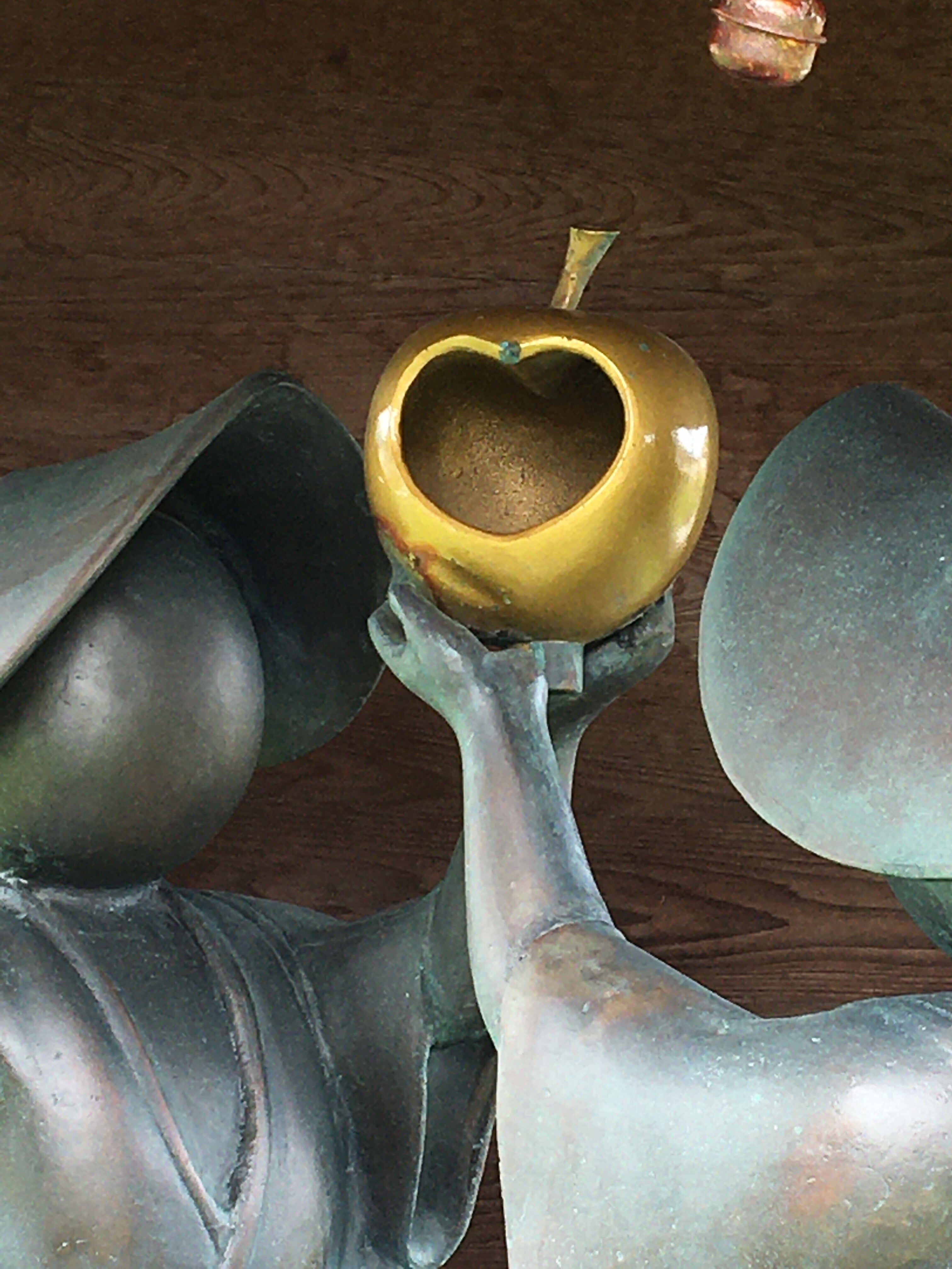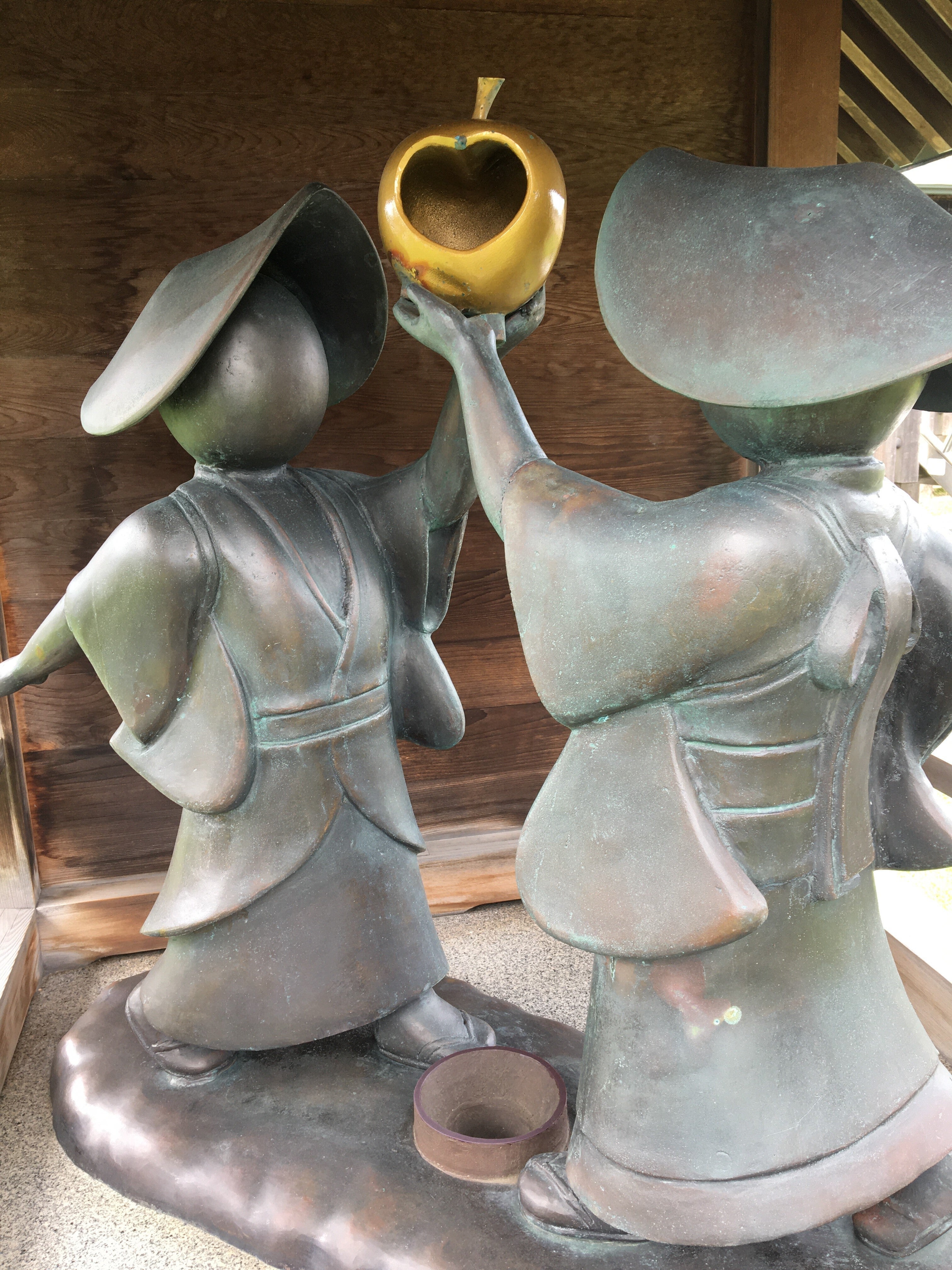 うわさですが!金のりんごに男女二人でコインを入れて下の受け皿に、コインが重なると、二人は結ばれる?一度は試してみては!