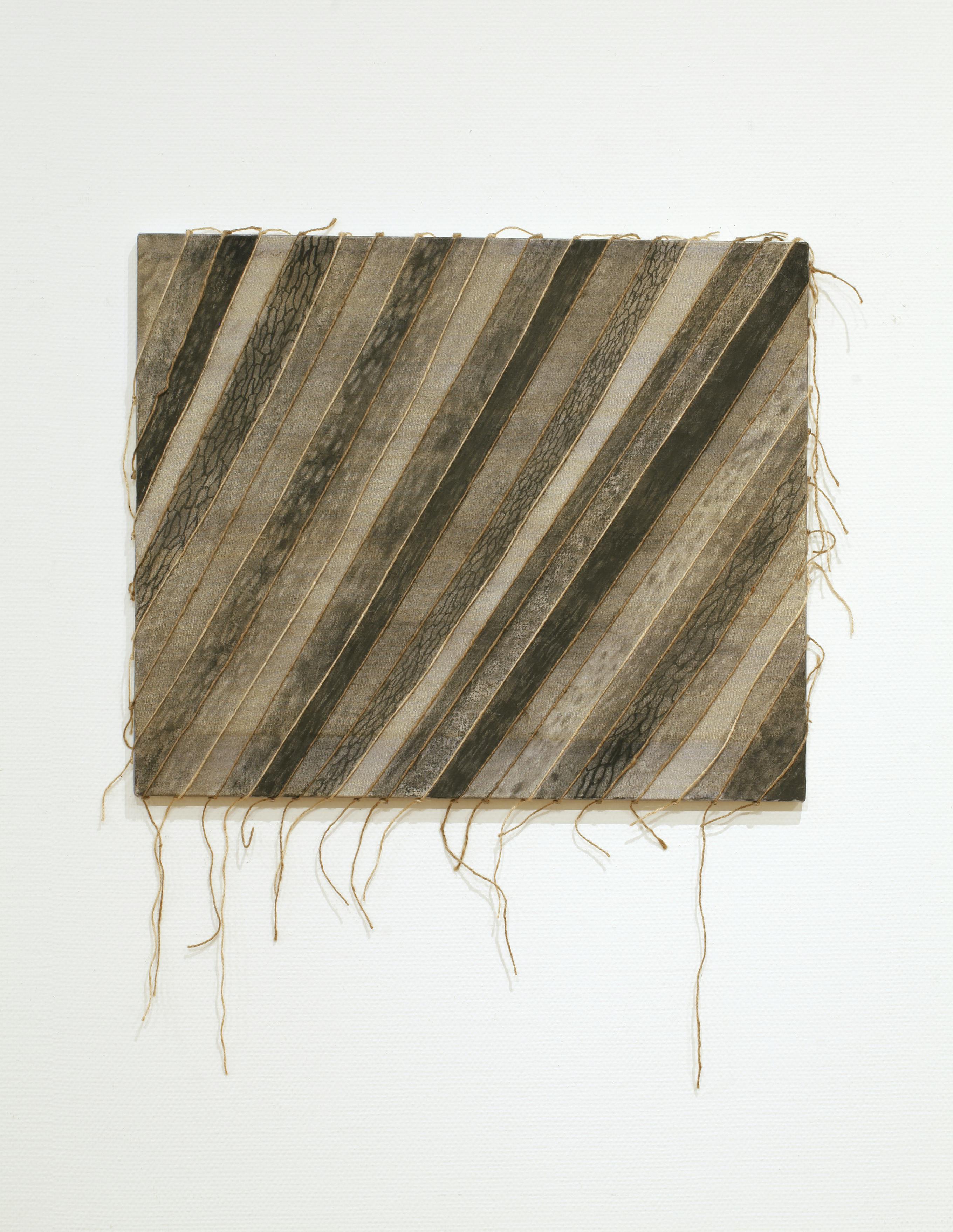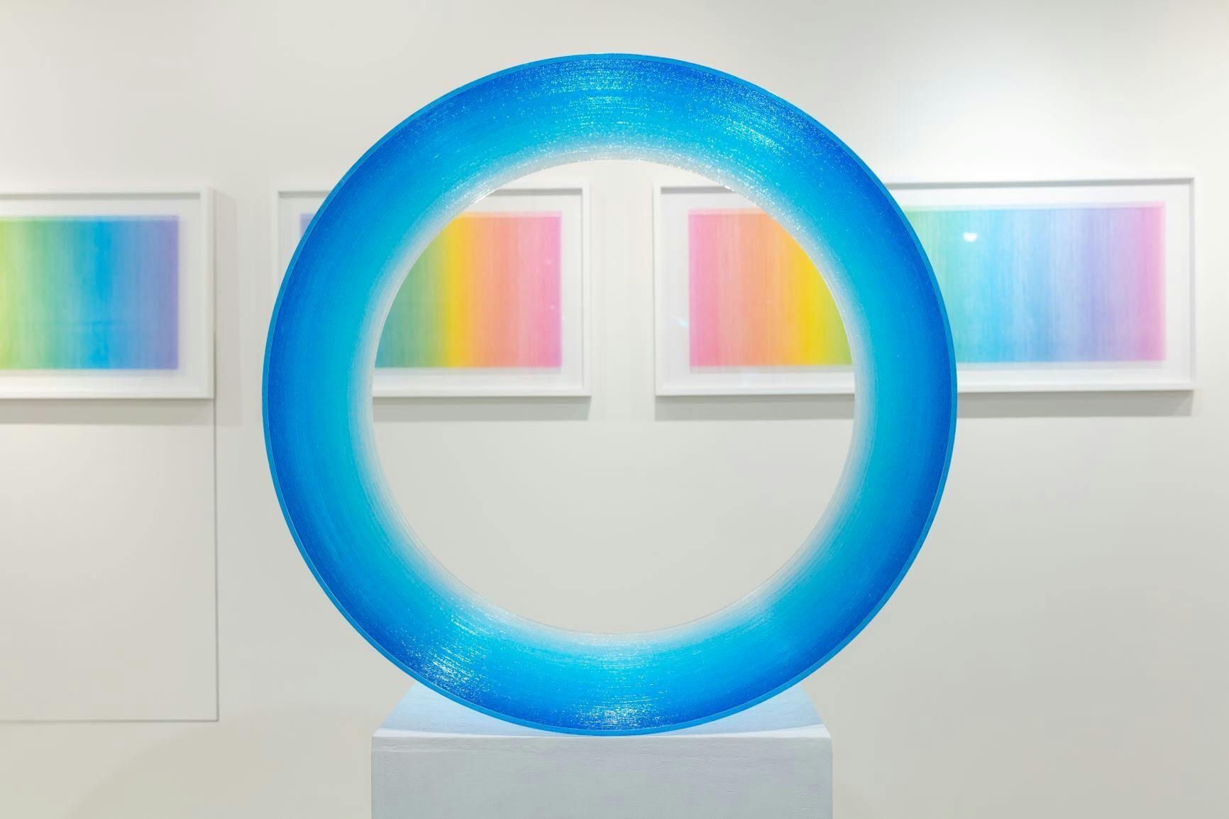 空気から光を紡ぎだすことをテーマに、細いアクリル絵の具の線を幾千にも引いてグラデーションを生み出す。