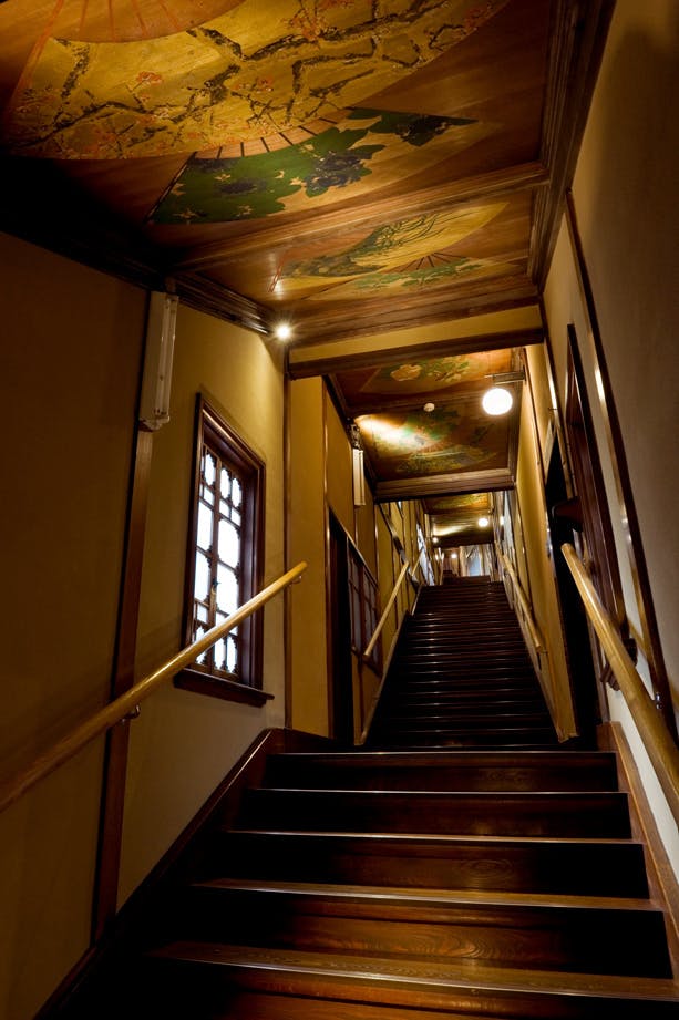 「百段階段」とは通称で、ホテル雅叙園東京の前身であるホテル雅叙園東京3号館にあたり、1935(昭和10)年に建てられた当館で現存する唯一の木造建築です。 食事を楽しみ、晴れやかな宴が行われた7部屋を、99段の長い階段廊下が繋いでいます。 階段は厚さ約5cmのケヤキ板を使用。 階段で結ばれた各部屋はそれぞれ趣向が異なり、各部屋の天井や欄間には、当時屈指の著名な画家達が創り上げた美の世界が描かれています。