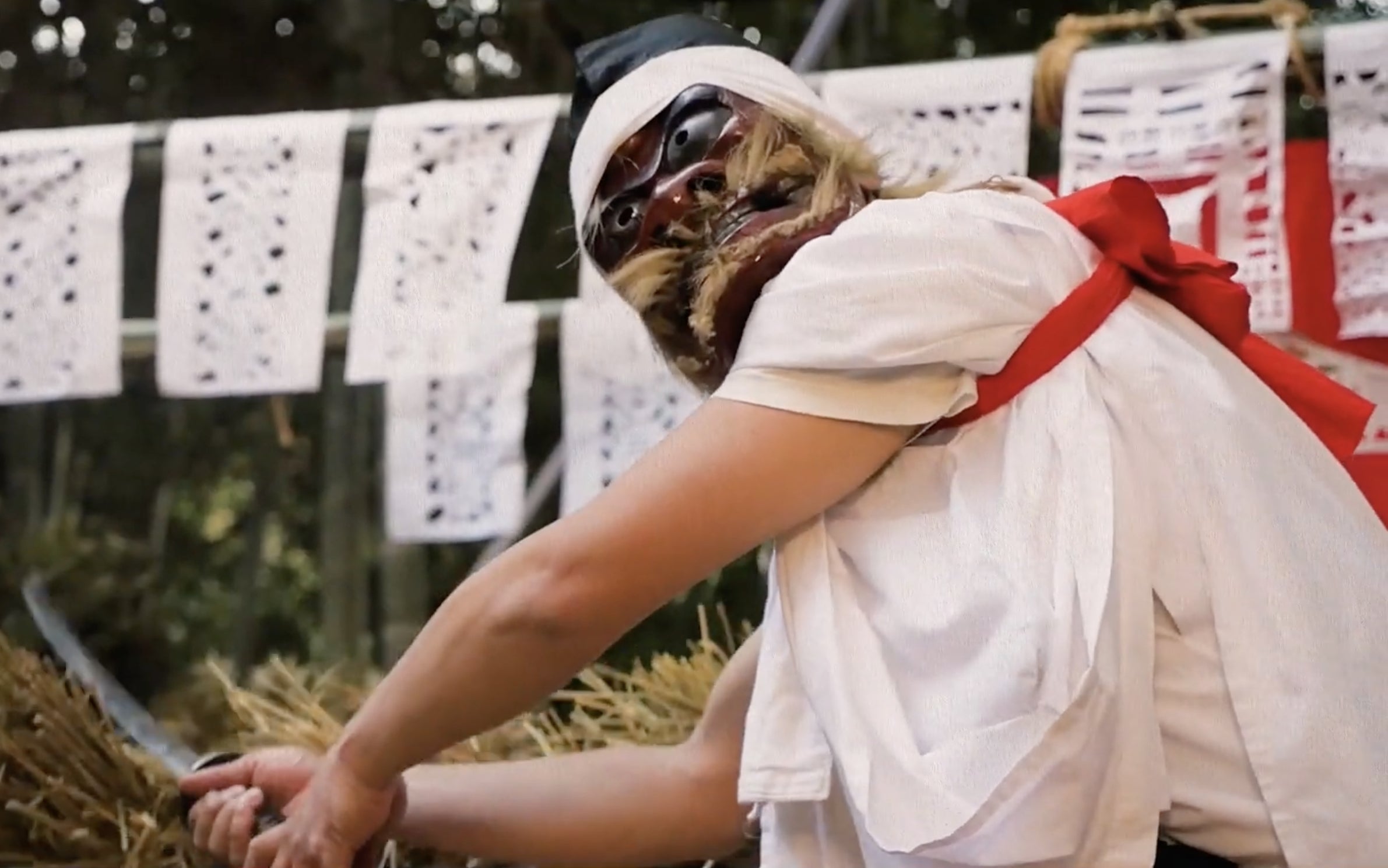 新富町で2月といえば、映画の題材にもなった神楽が奉納される季節です。毎年2月17日、「茶心」から車で10分程度のところにある新田(にゅうた)神社で行われる神楽は、大蛇に見立てた大綱を真剣で切りさばく「蛇切(じゃきり)」のクライマックスで有名。