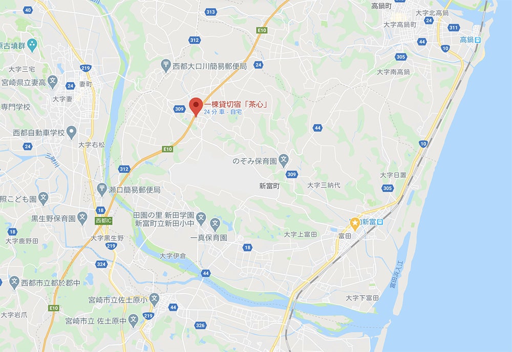 JR日向新富駅から「茶心」まで車で約15分(日向新富駅から徒歩15分のところにシェアカーがあります。15分200円〜で利用可)